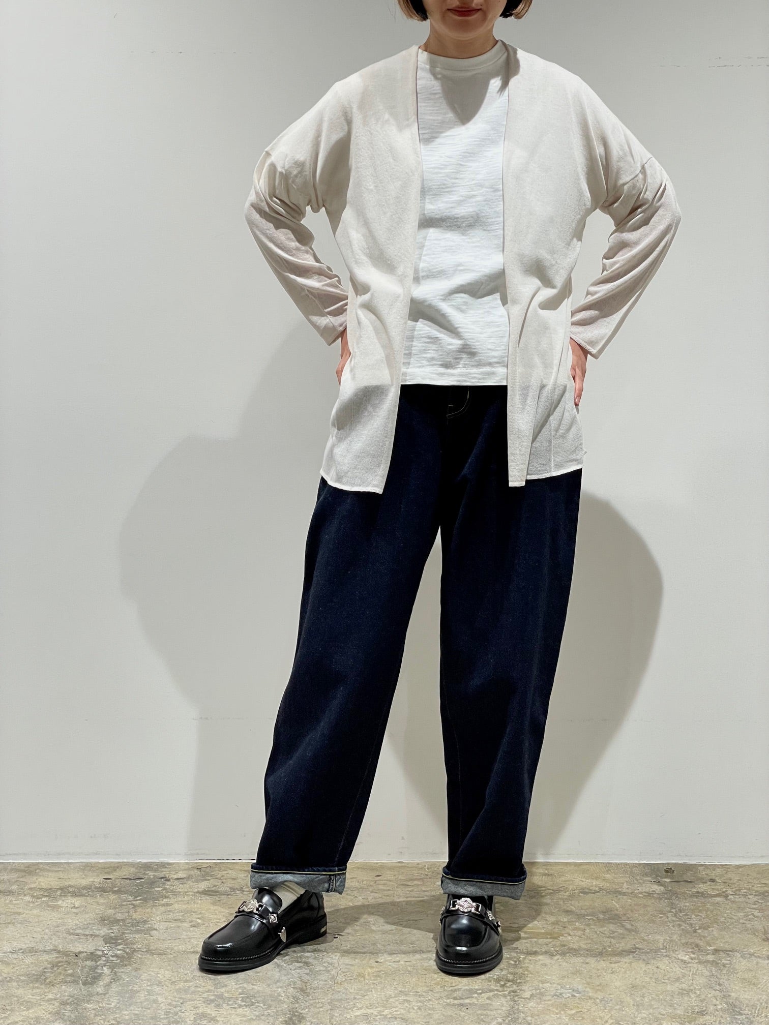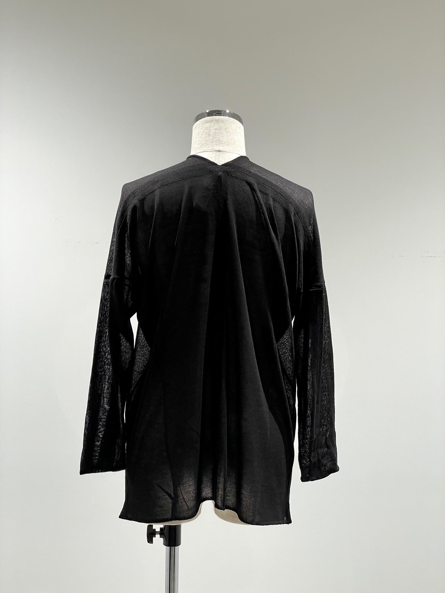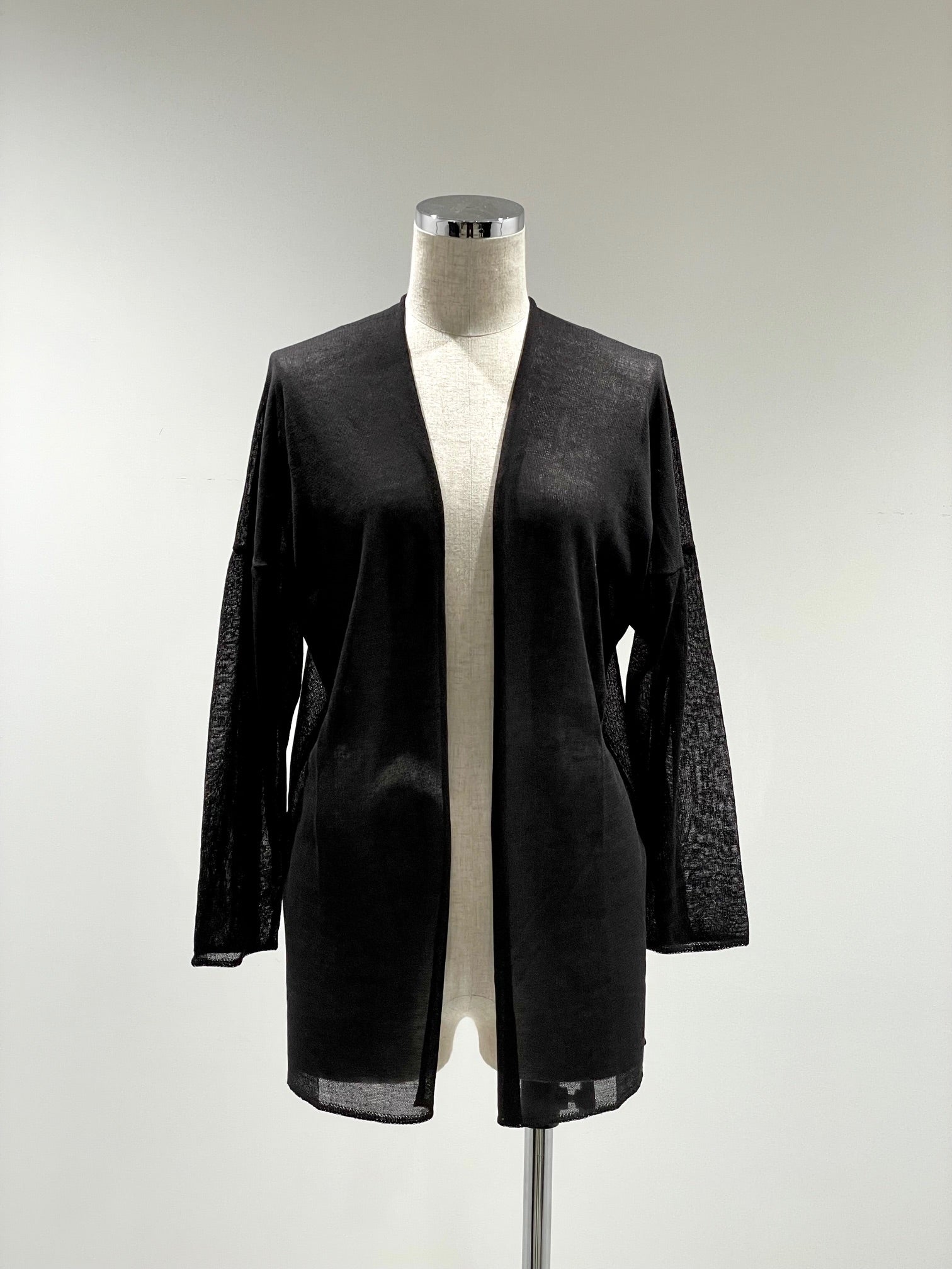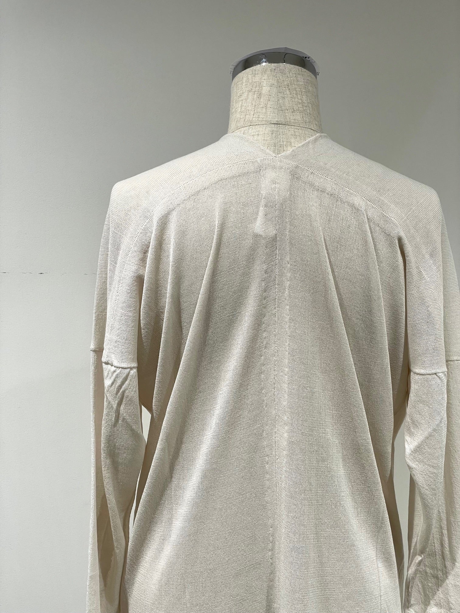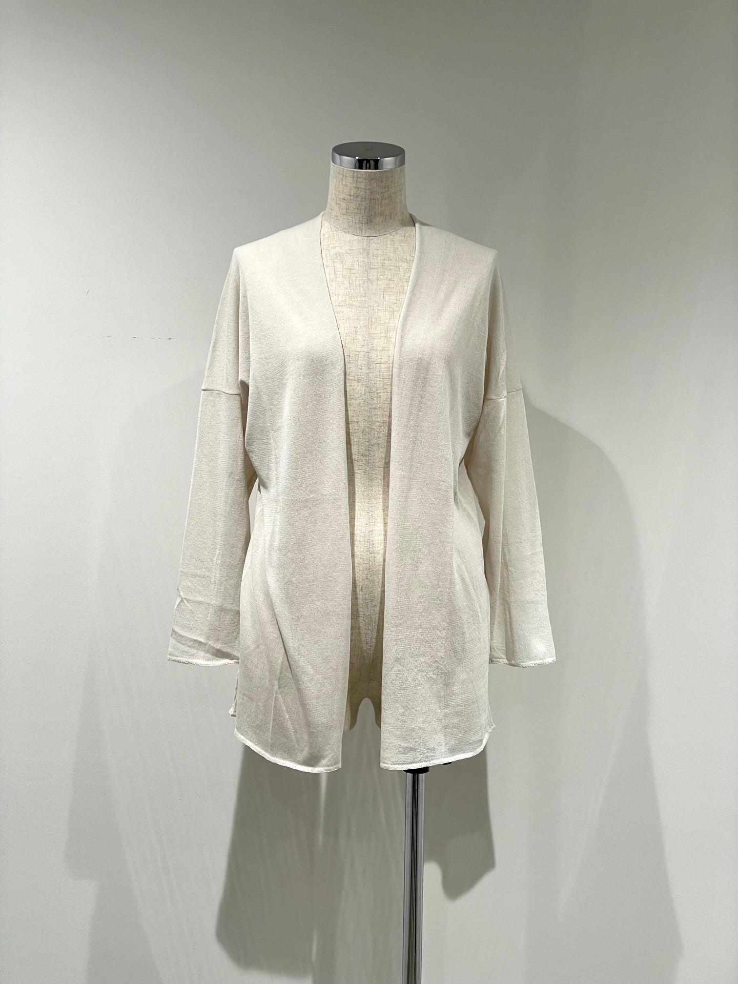 シルクのように滑らかで、柔らなバンブー素材のニット。少し透け感があり清涼感のある素材感。後ろの立体的な切り替えで体を丸く覆うようなシルエット。サラッとゆったり羽織れる前開きのドロップショルダー。家庭での洗濯可能。