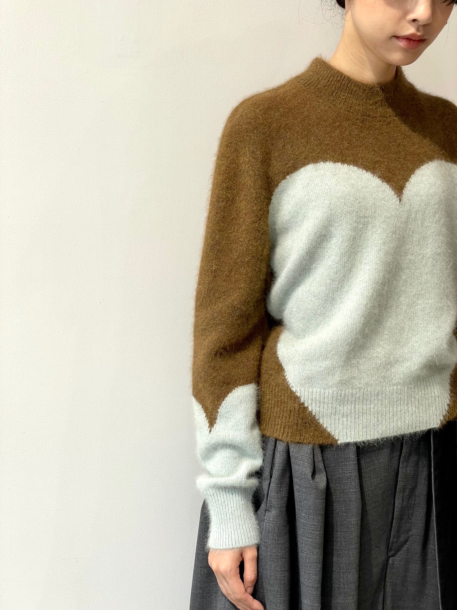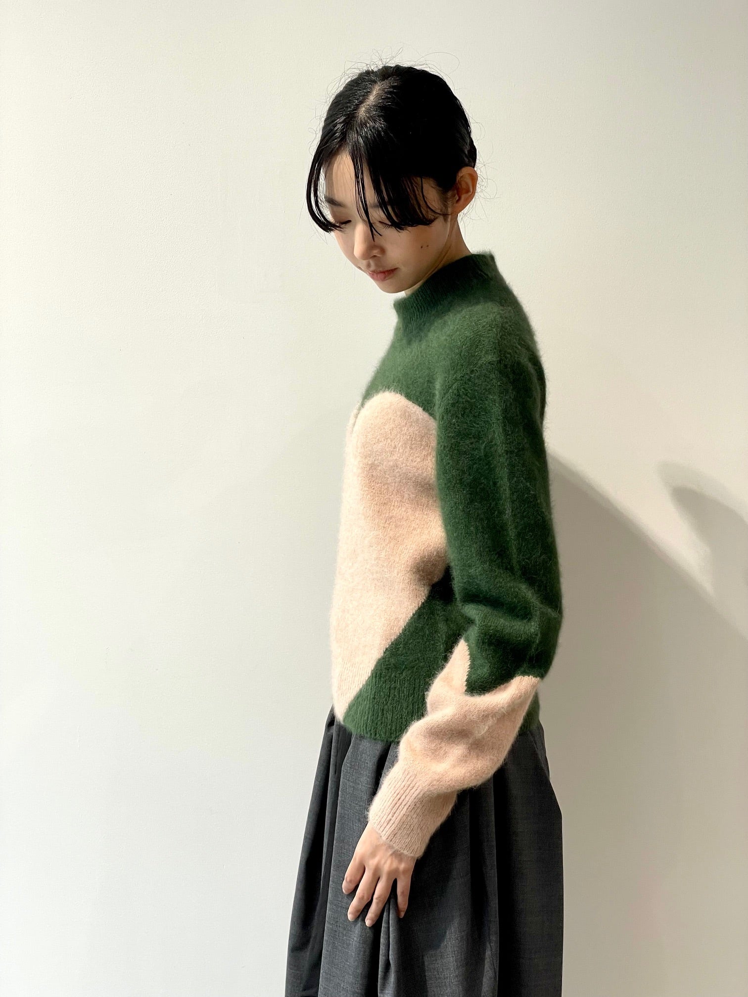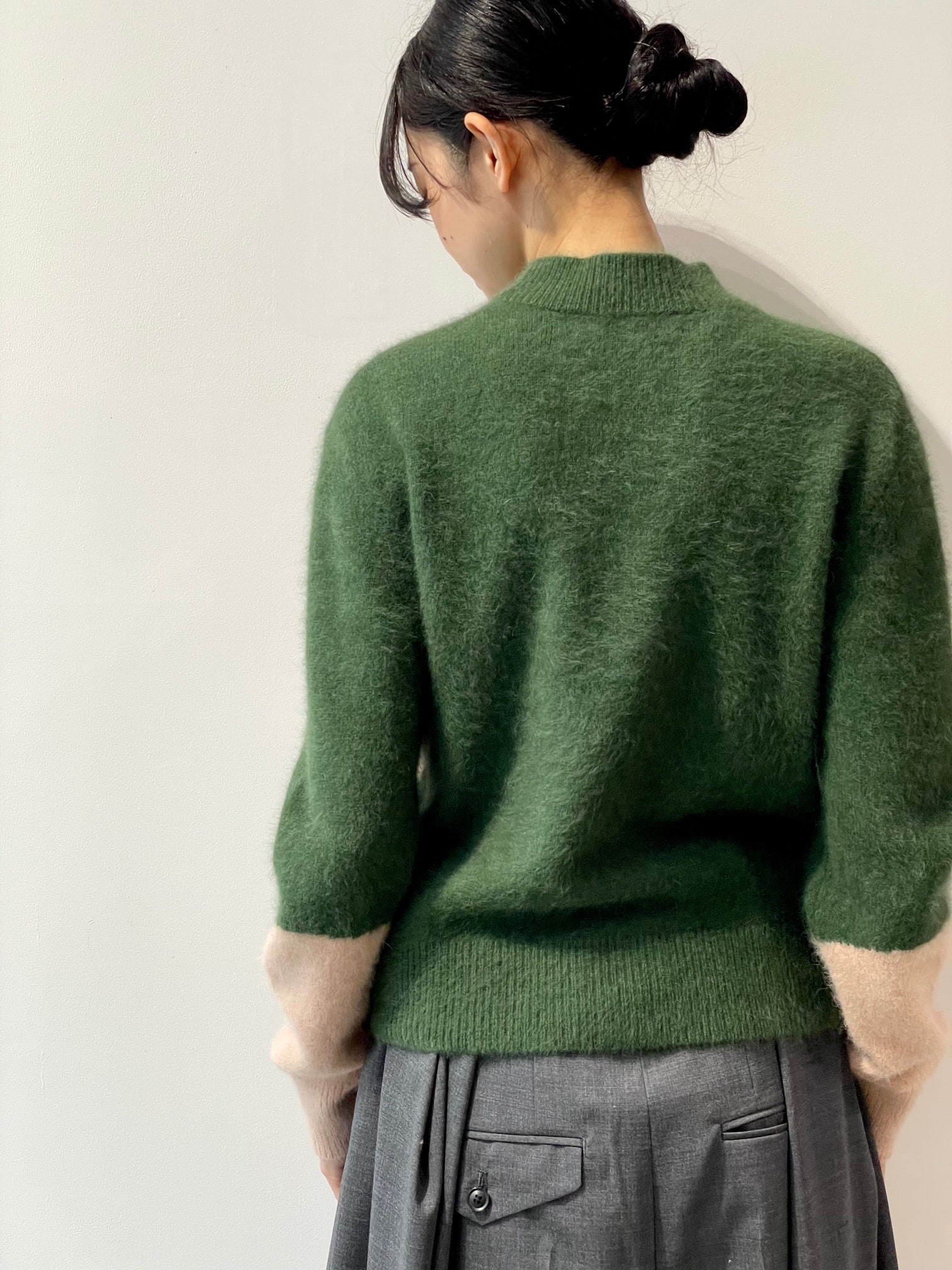 ヘアリーな起毛が特徴のラクーン混ニット。コンパクトなシルエット。襟のリブが2重。温かみのある素材。