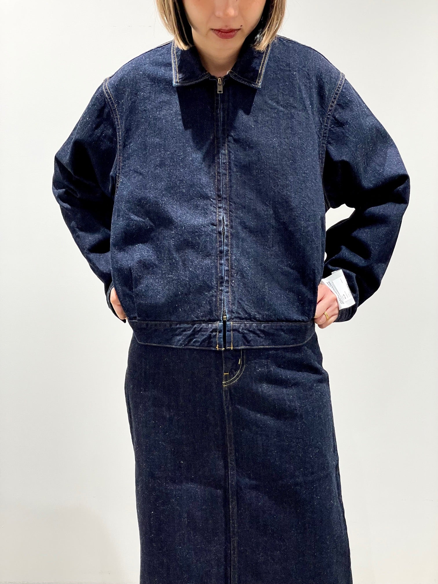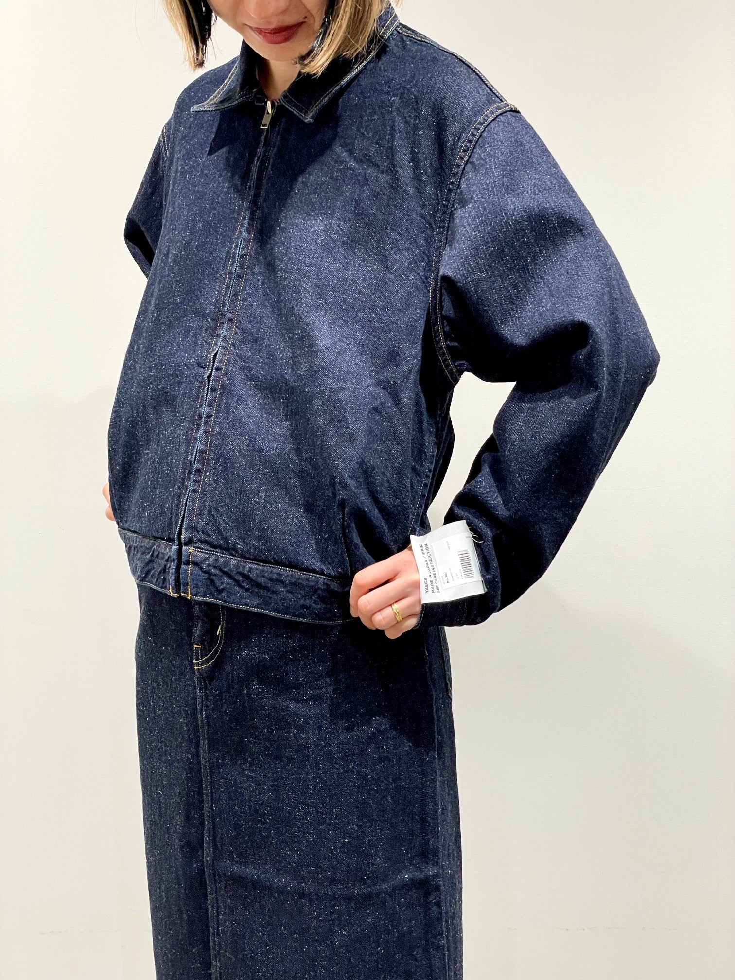 コットンヘンプ生地で少しネップのような表面。フロントジップの少し着丈の短いブルゾン。後ろに2本のタックで丸みを持たせたかわいいシルエット。柔らかで、リラックスした着心地。
