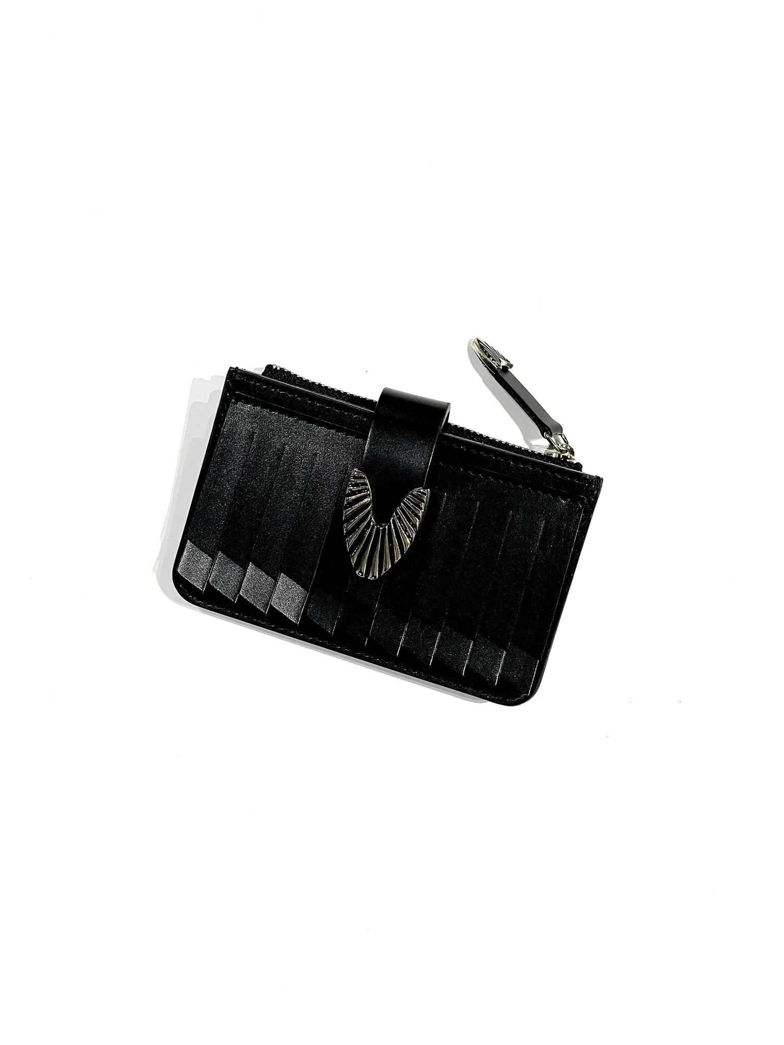 内側にカードスロット、コインポケット、紙幣用ポケット。フロントスナップボタン開閉。表にレザーフリンジ。