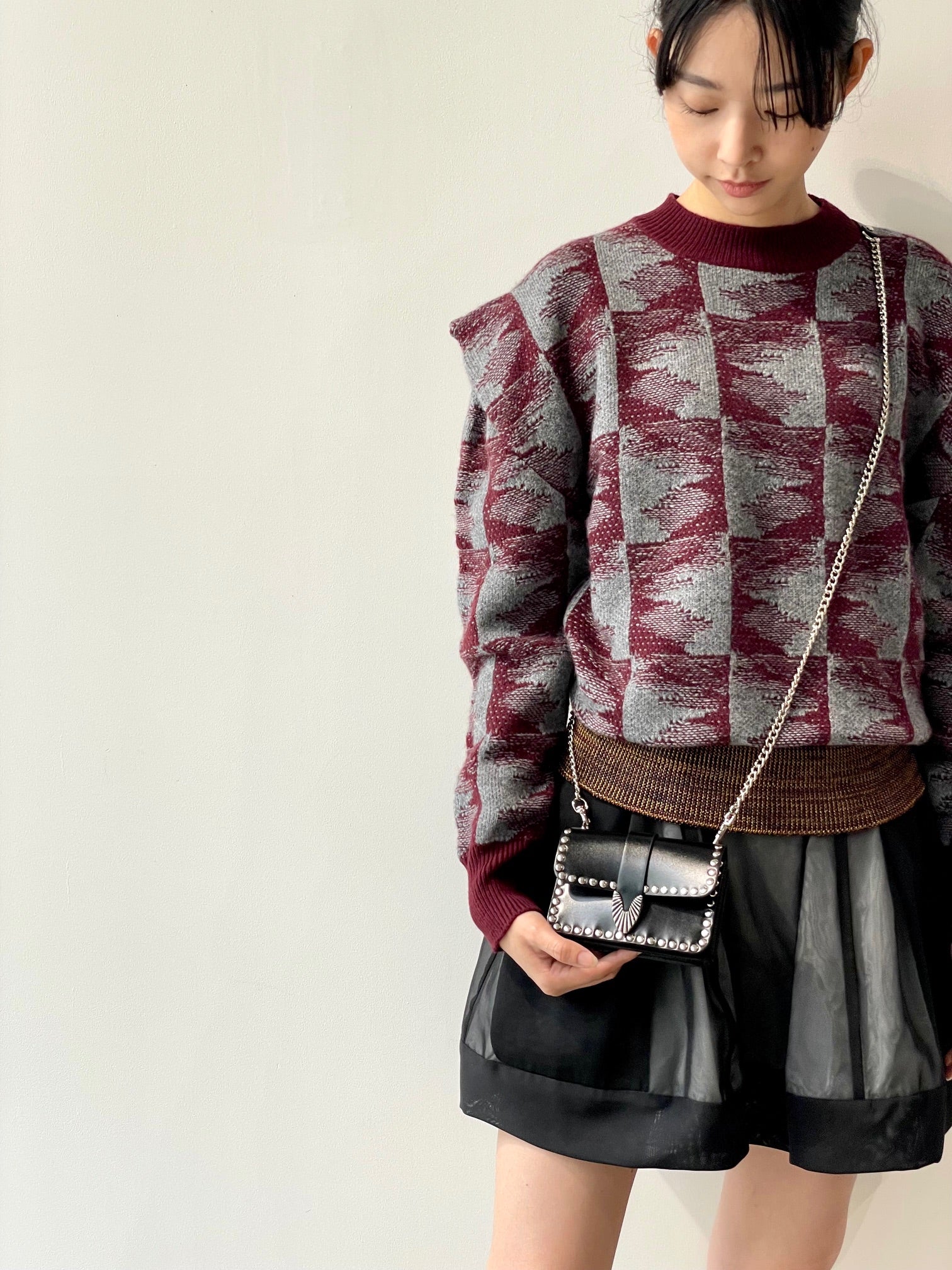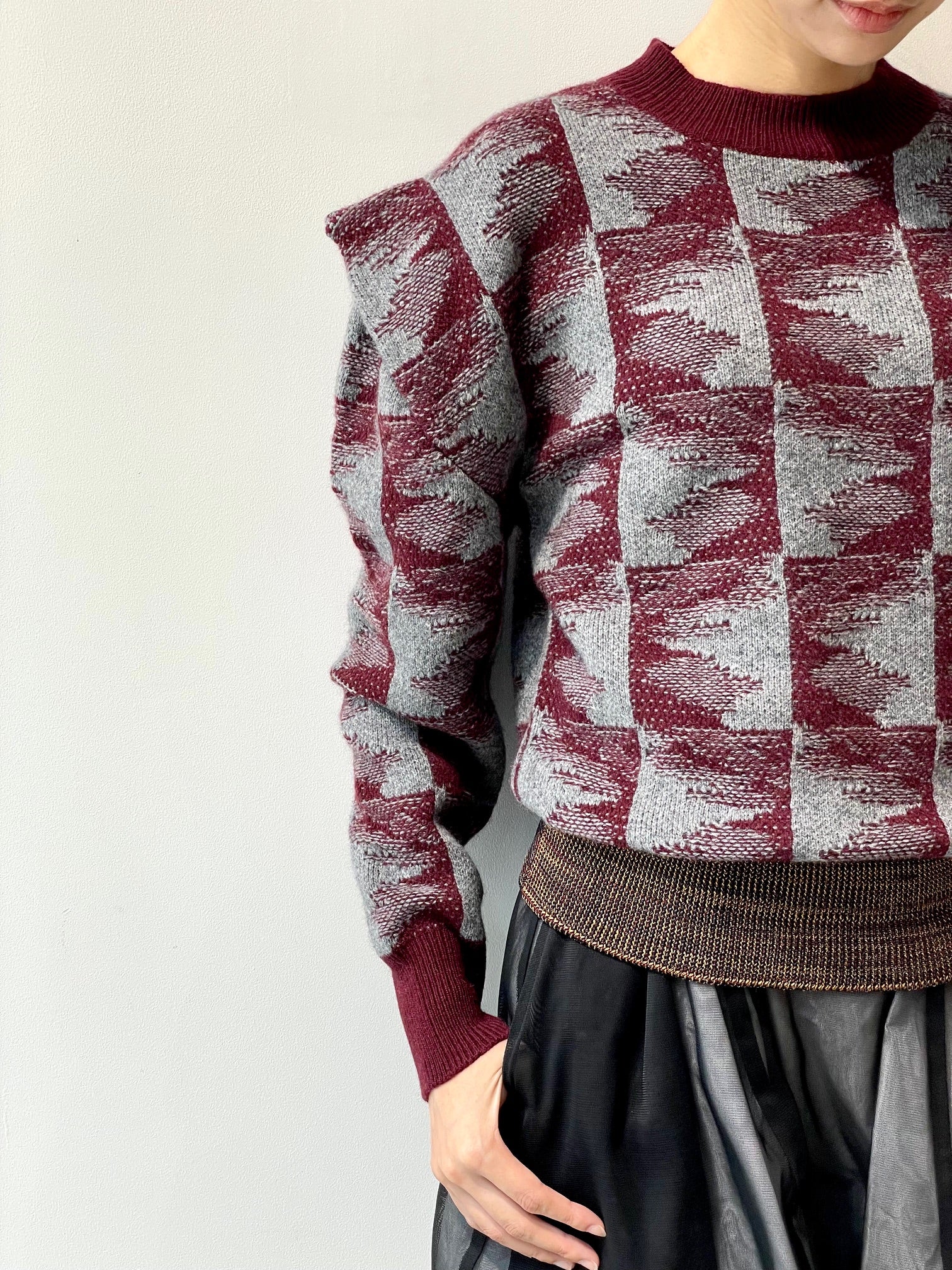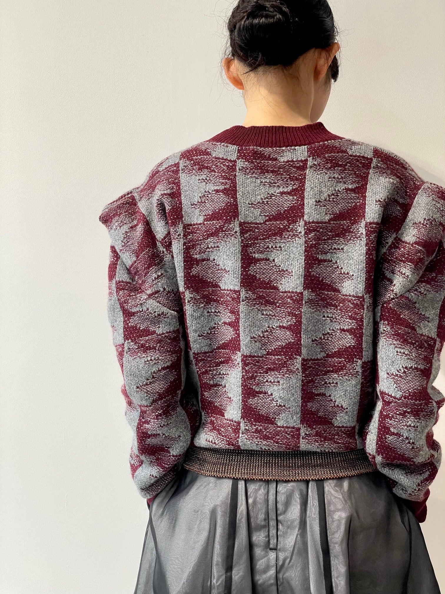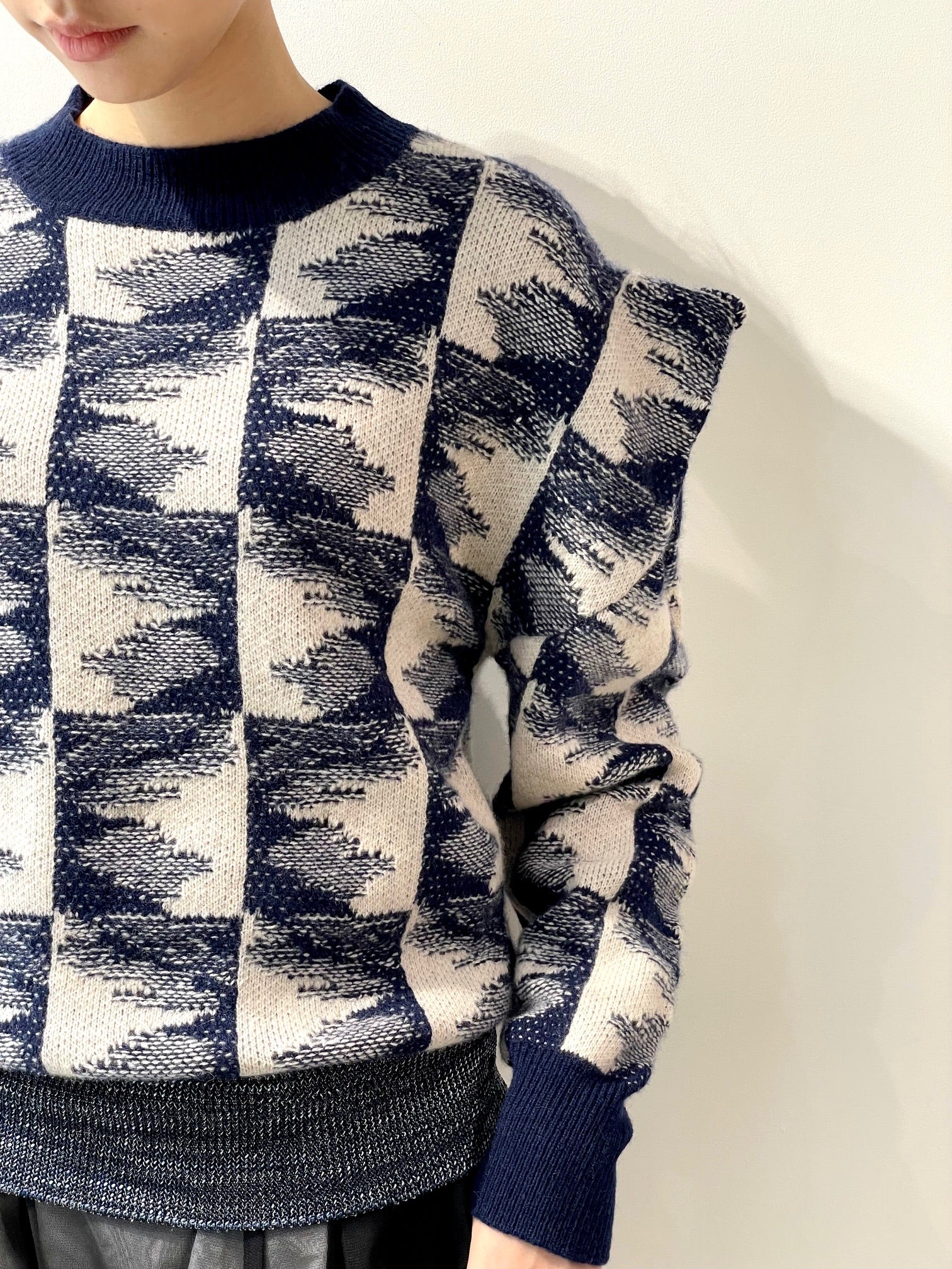 少し厚手でソフトなジャガード編みニット。スウェットのような着心地。裾リブ配色。両肩にデザイン。