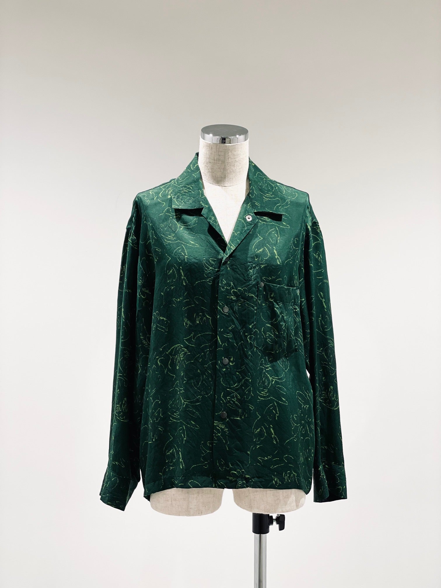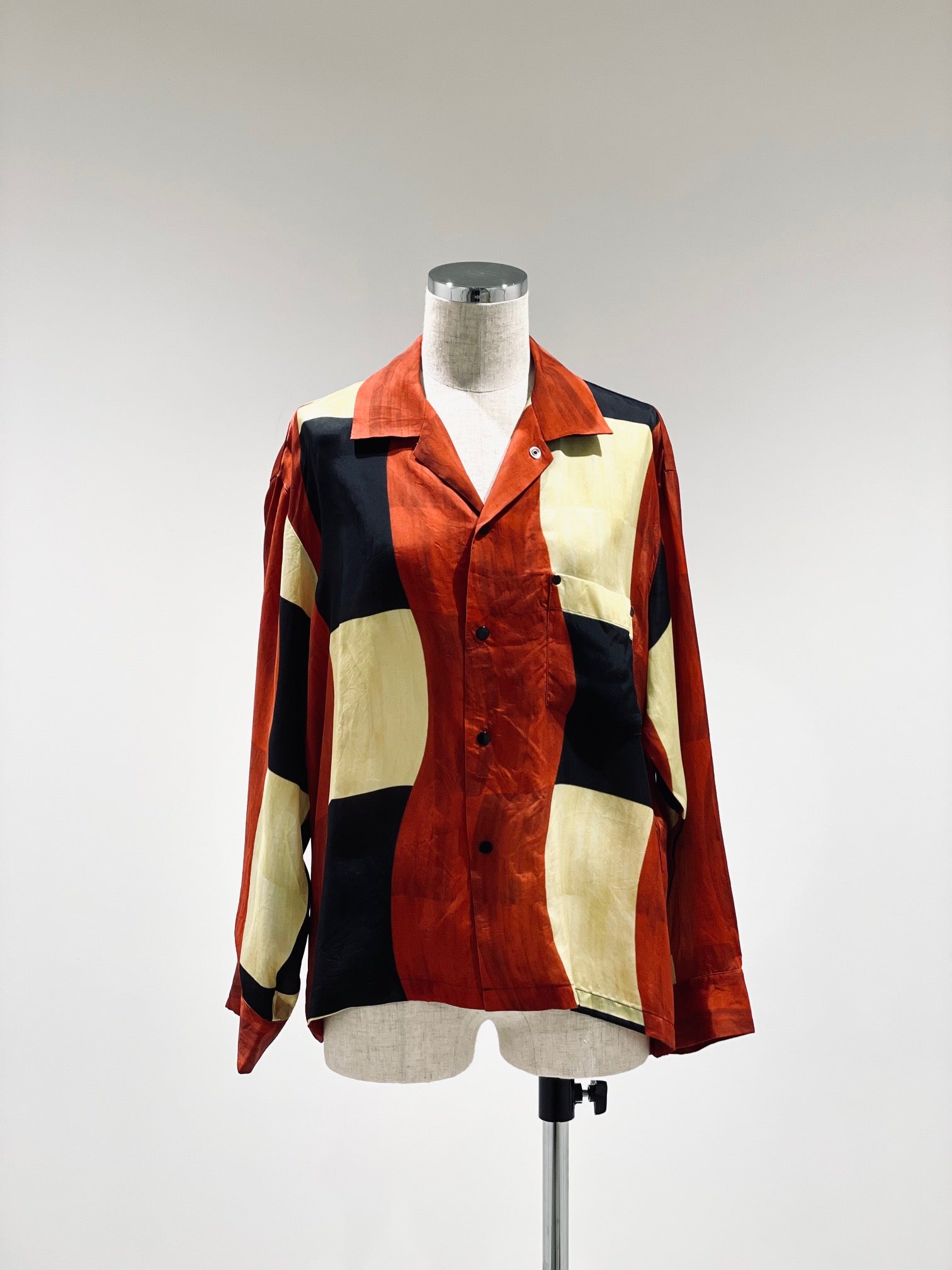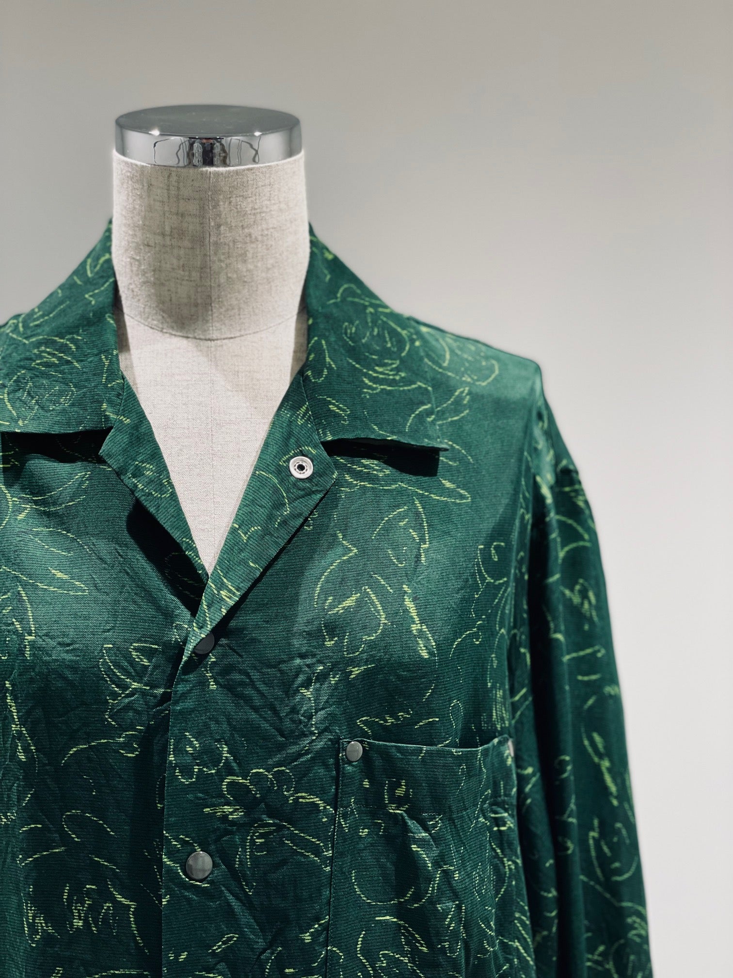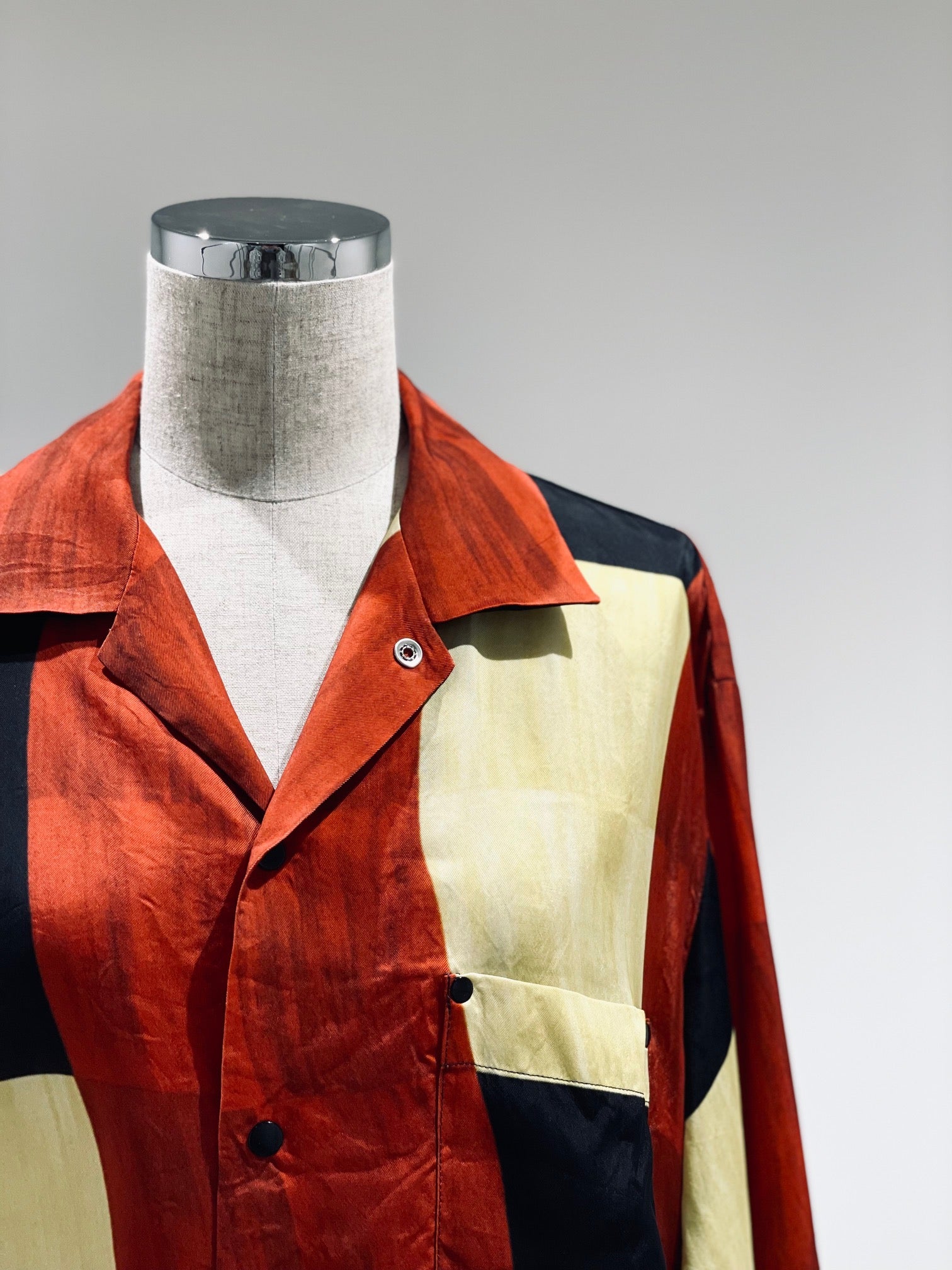 オリジナル柄のプリントキュプラ素材。チェッカー柄、ペイズリープリント、フラワーモチーフ柄。ややゆったりとしたシルエット。スナップボタン開閉。ユニセックス。