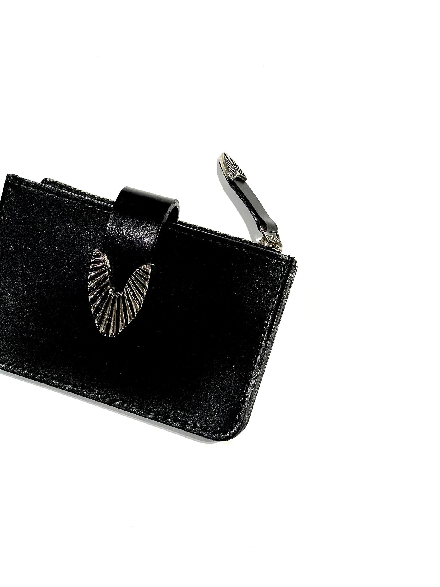 内側にカードスロット、コインポケット、紙幣用ポケット。フロントスナップボタン開閉。表面と裏面が配色。