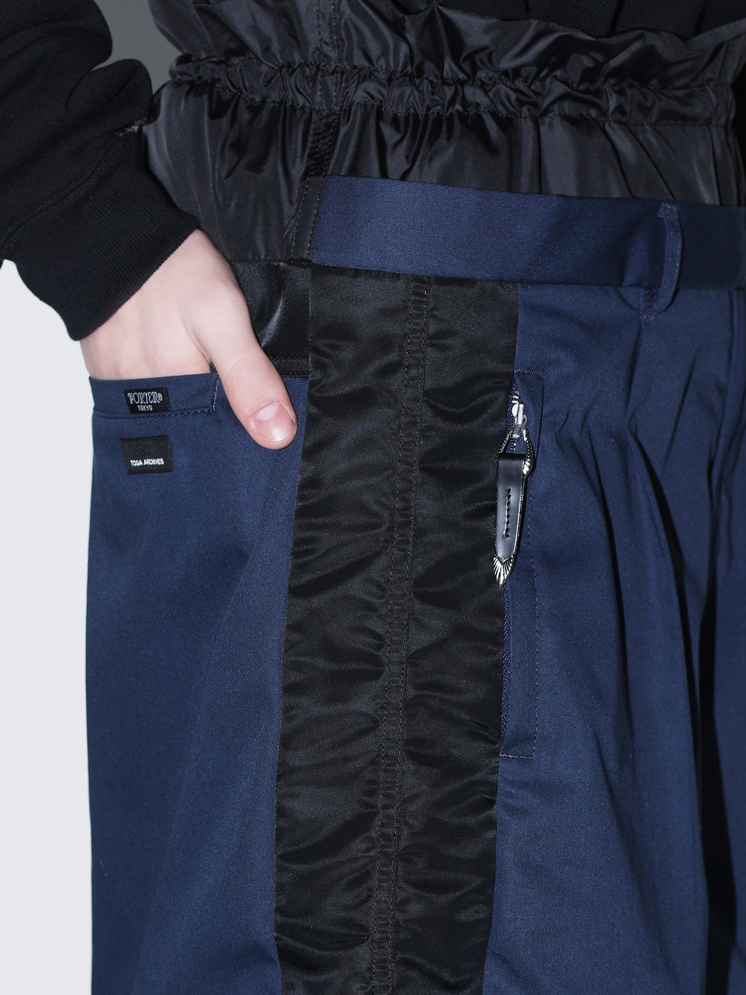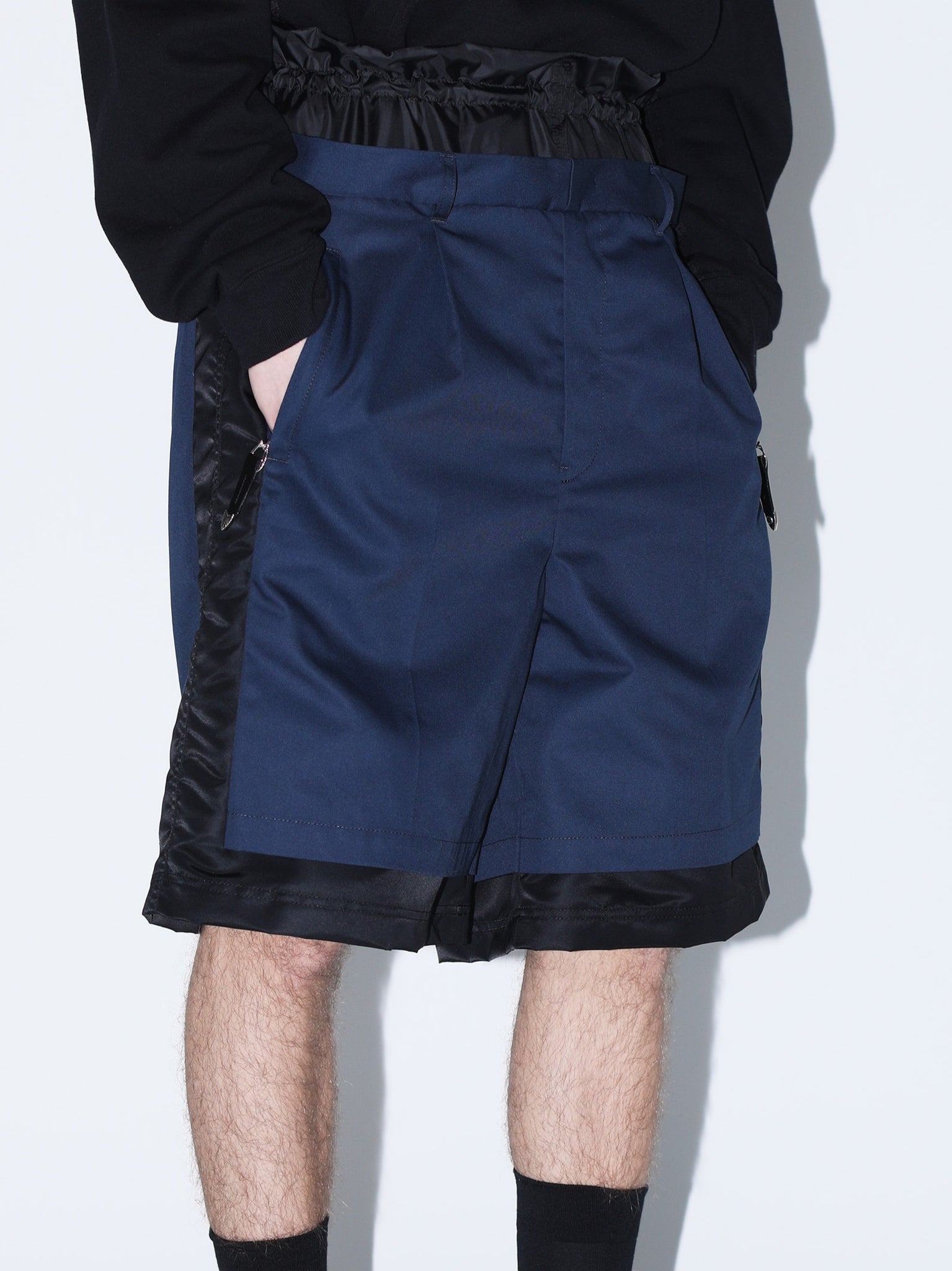 ウエストドローコード。サイドとウエスト部分に異素材の切り替え。ひざ下丈。ユニセックス。