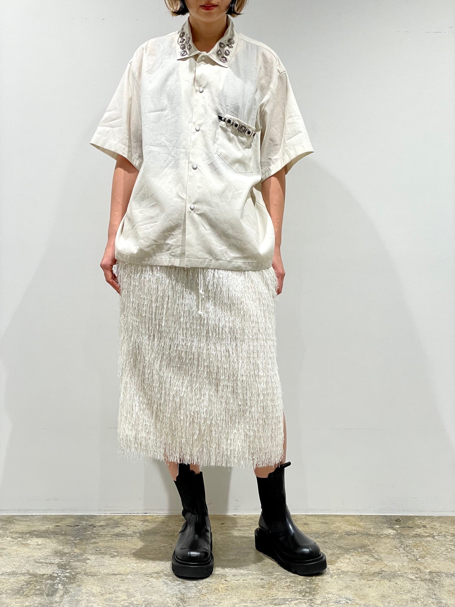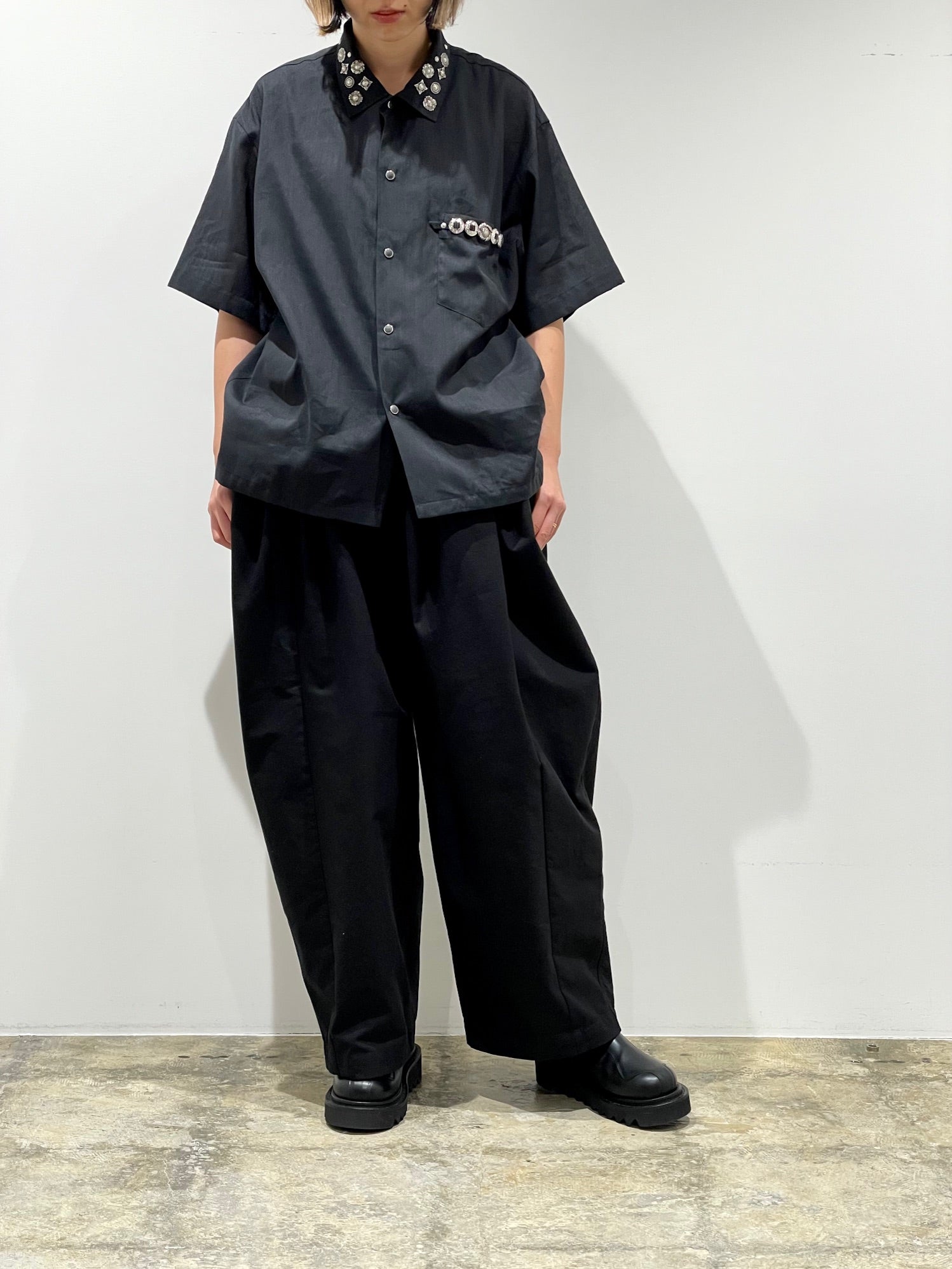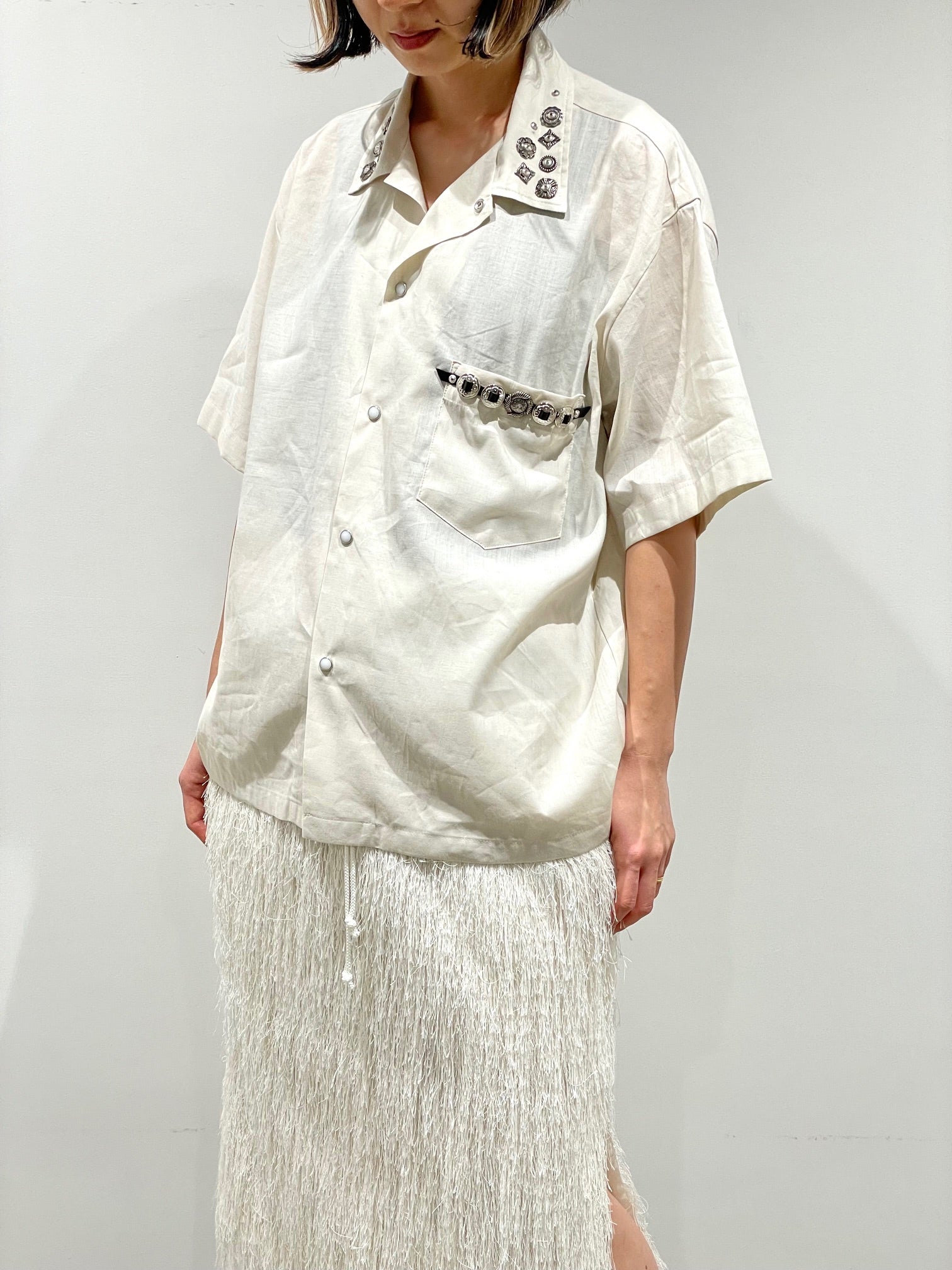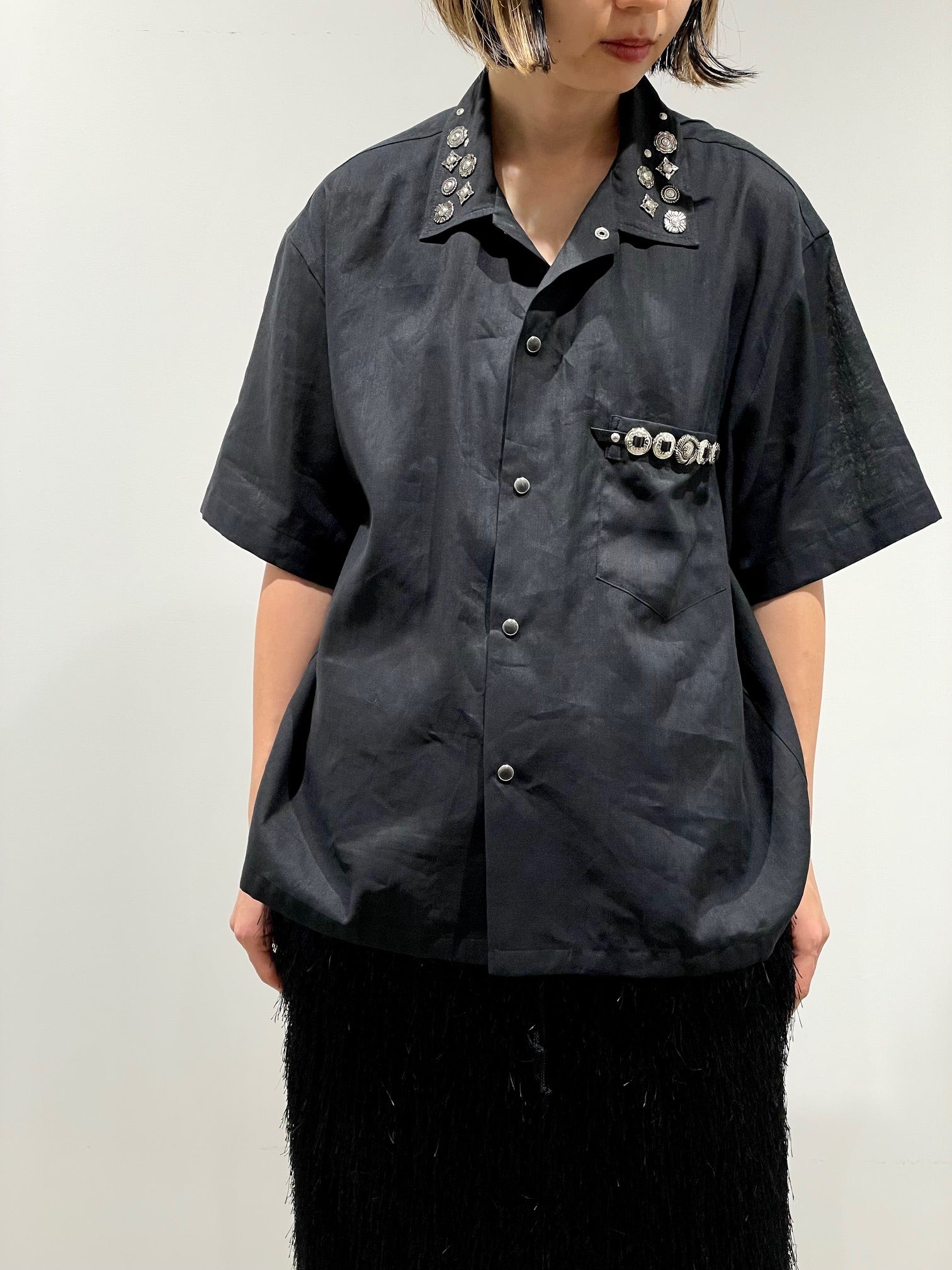 定番のスタッズやコンチョを施したシャツ。左胸ポケット。開襟でもシャツカラーでも着用可能。コットンリネン素材の少しシワ感のある柔らかな風合い。ユニセックス。