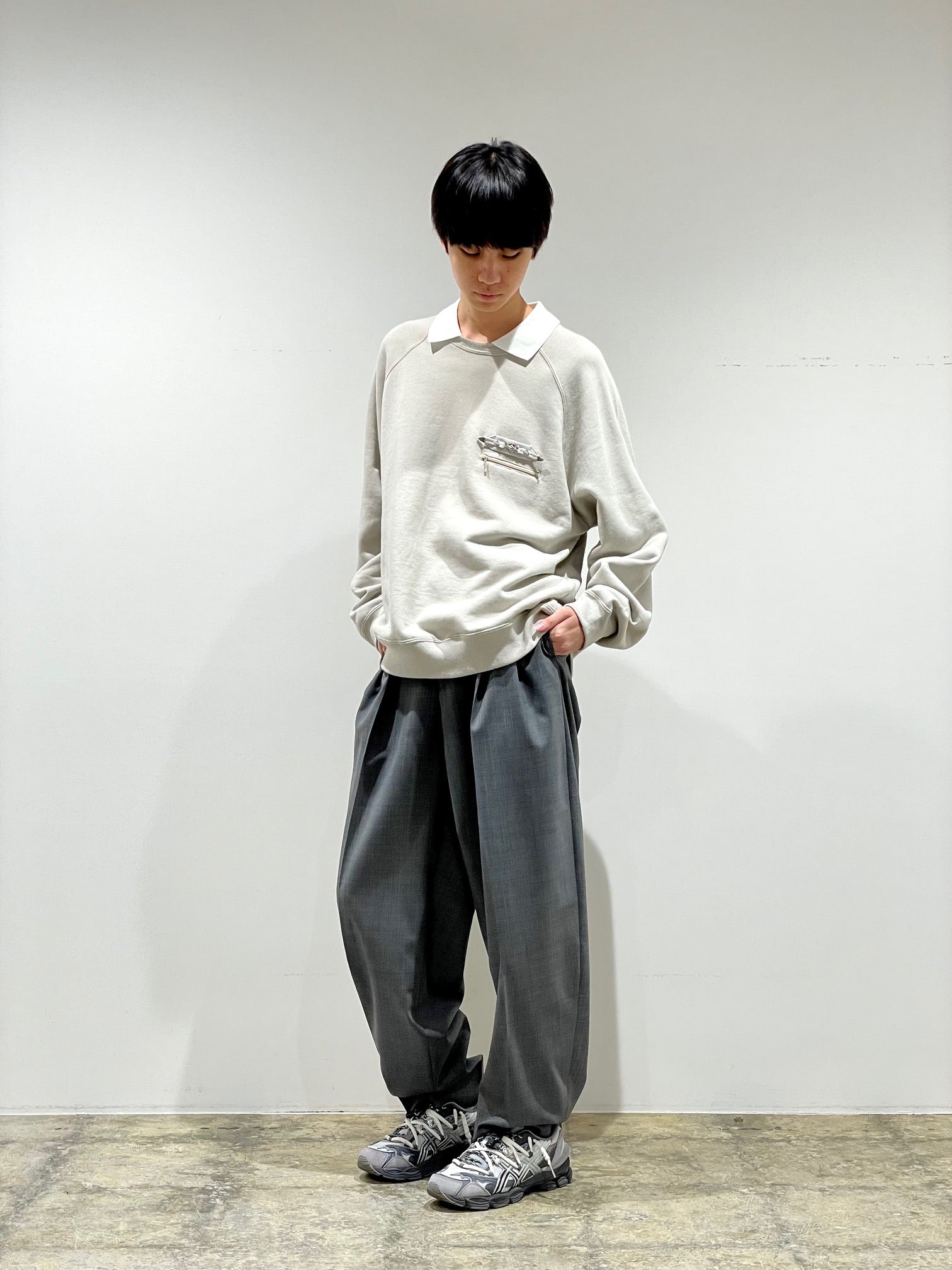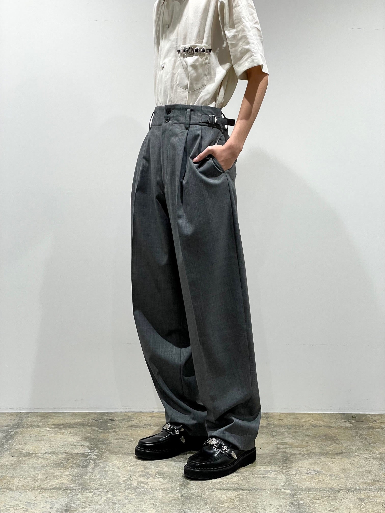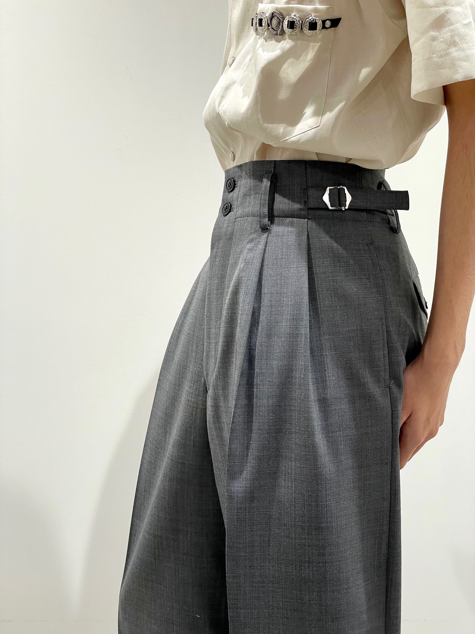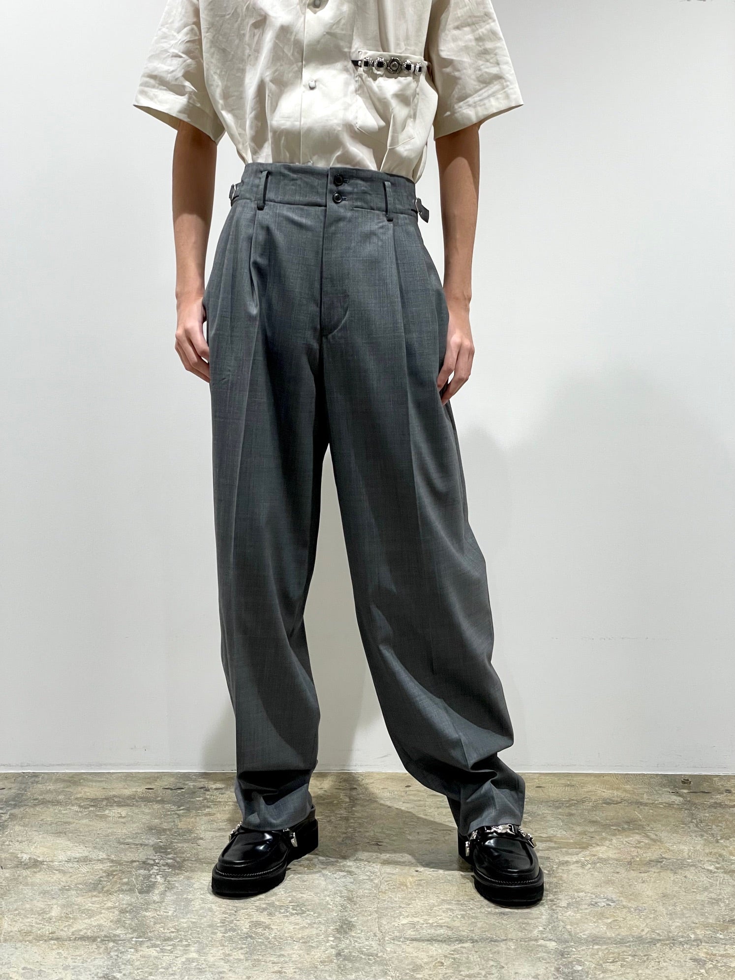 ドライタッチなしなやかなポリウール素材。ツータックの丸みのあるテーパードシルエット。両サイドのウエストにベルト。