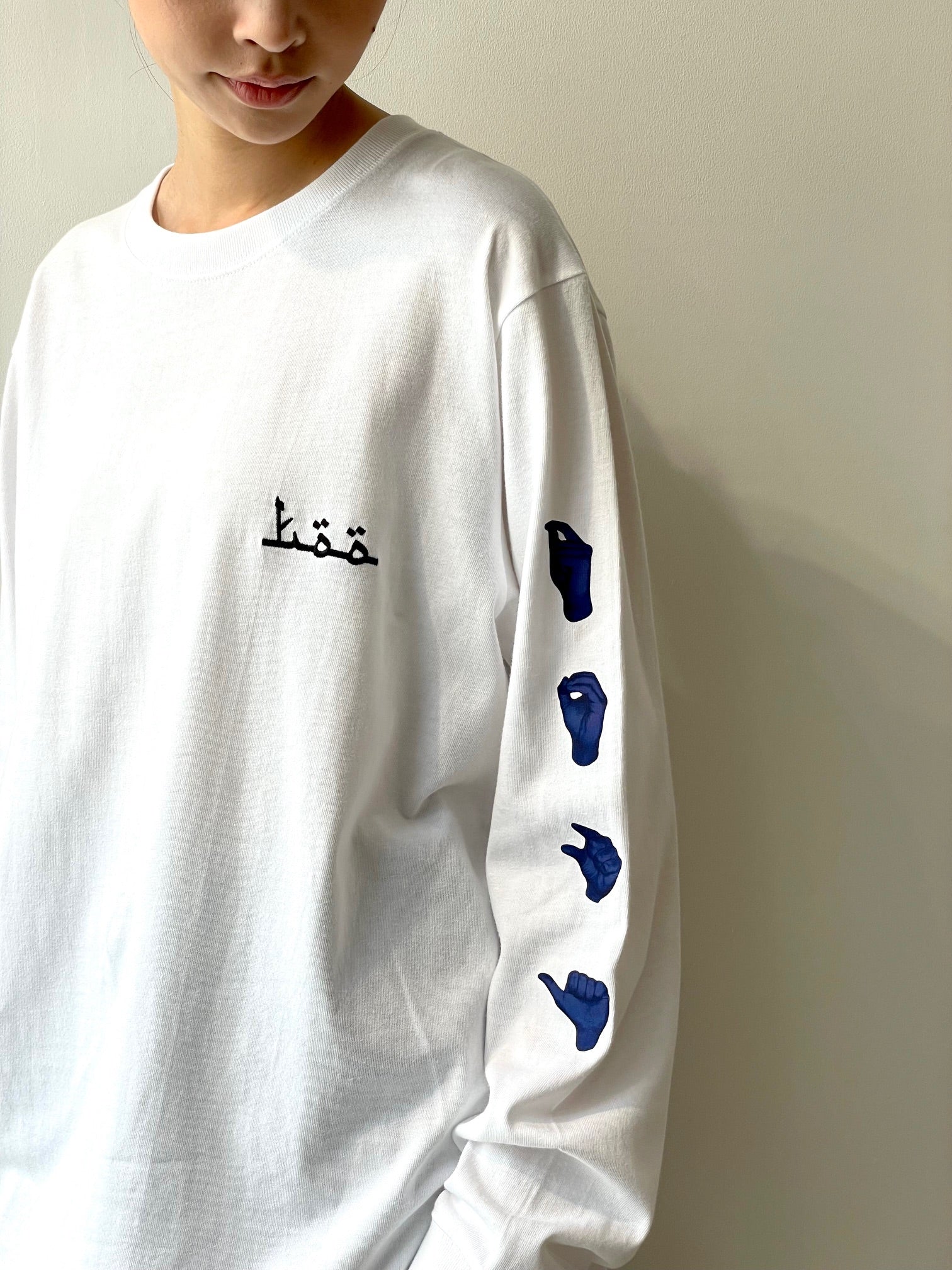 左胸に刺繍ロゴ。バックと袖にプリント。袖のプリントは左右で異なる。袖リブ。