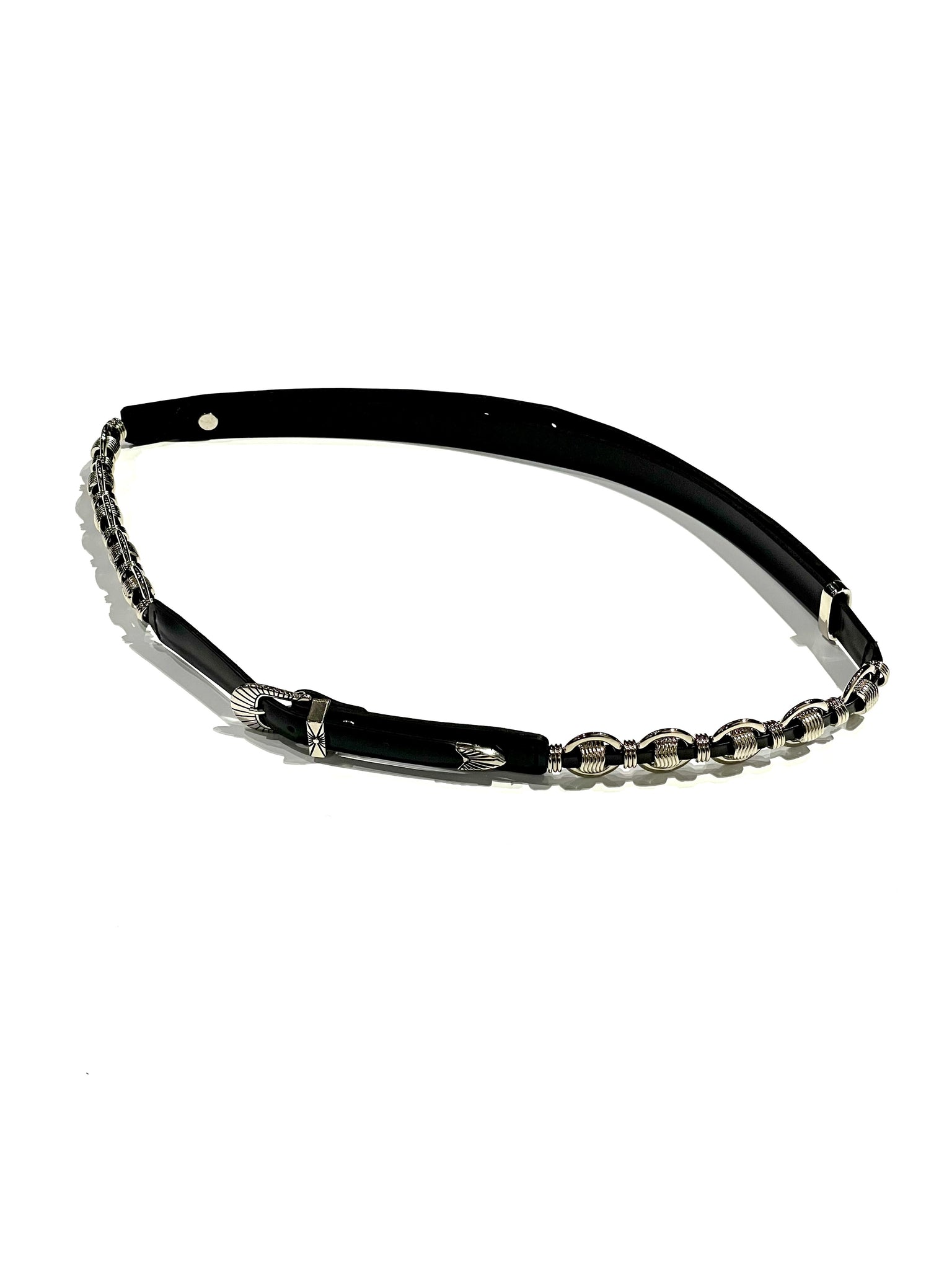 リング状のメタルとレザーがコンビになった細ベルト。後ろのギボシで長さ調節可能。