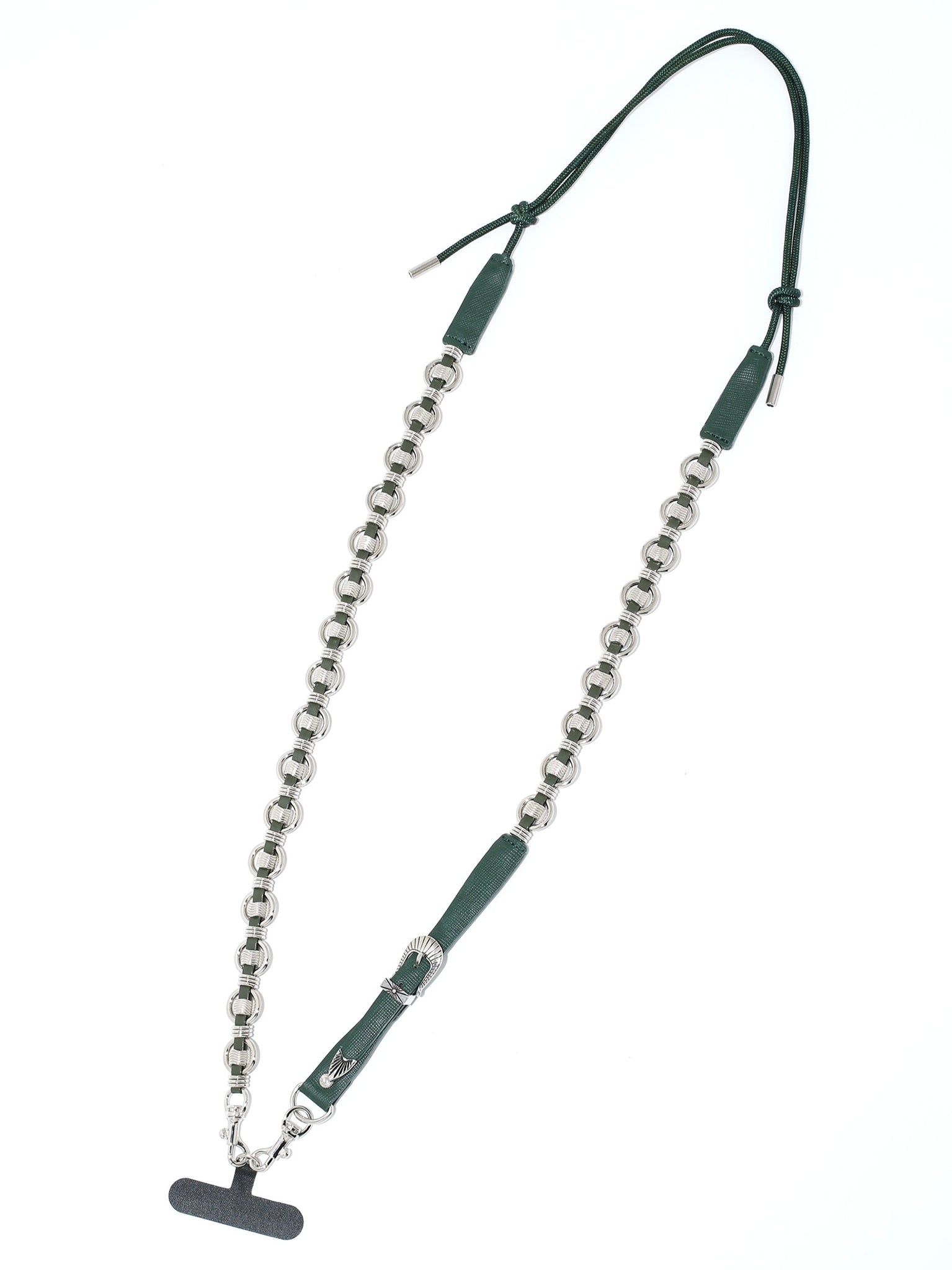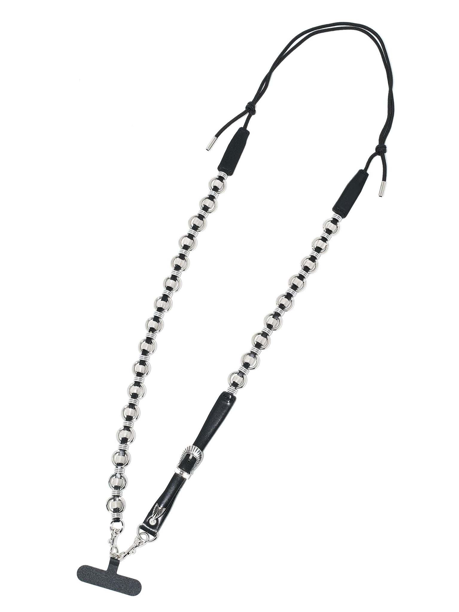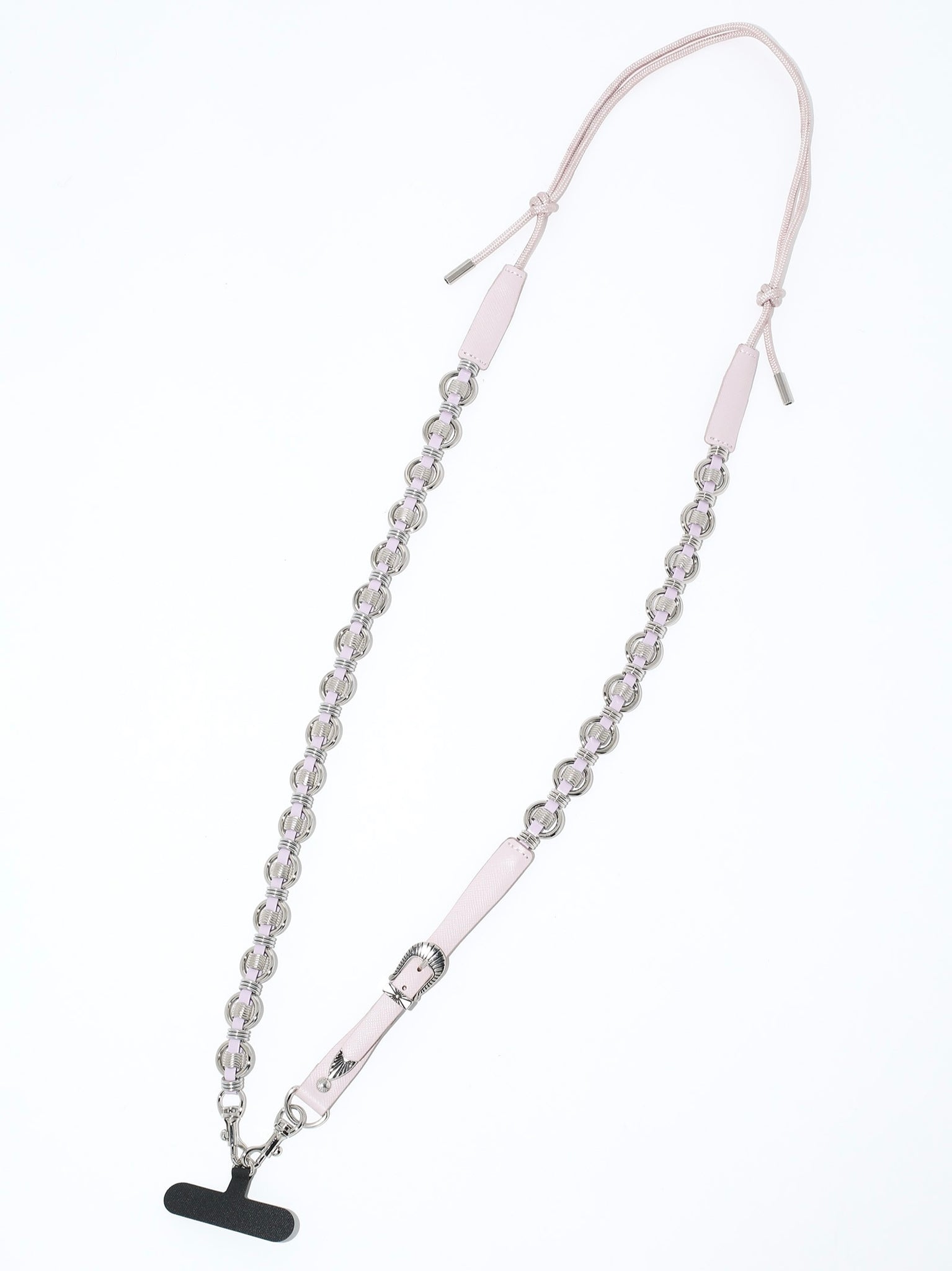 リング状のメタルパーツ。長さ調整可能なストラップ。充電口が中央に開口されているケースに対応。バッグなどのストラップとしても使用可能。