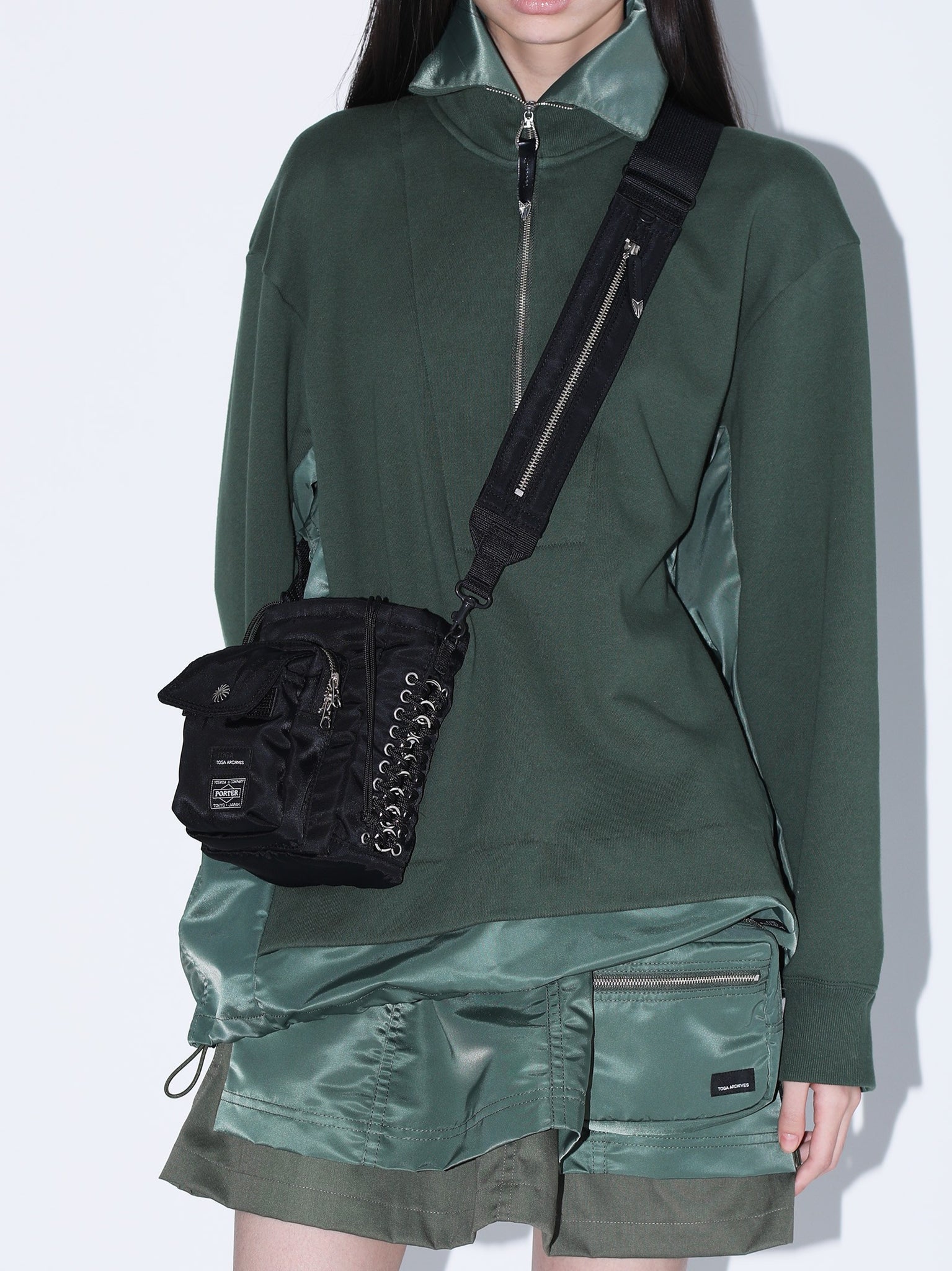 前方にファスナー開閉とスナップのポーチ。入口がドローコード開閉。サイドにリング編み込み。ショルダーストラップ着脱可能。ショルダーストラップに蛇腹に開く収納。