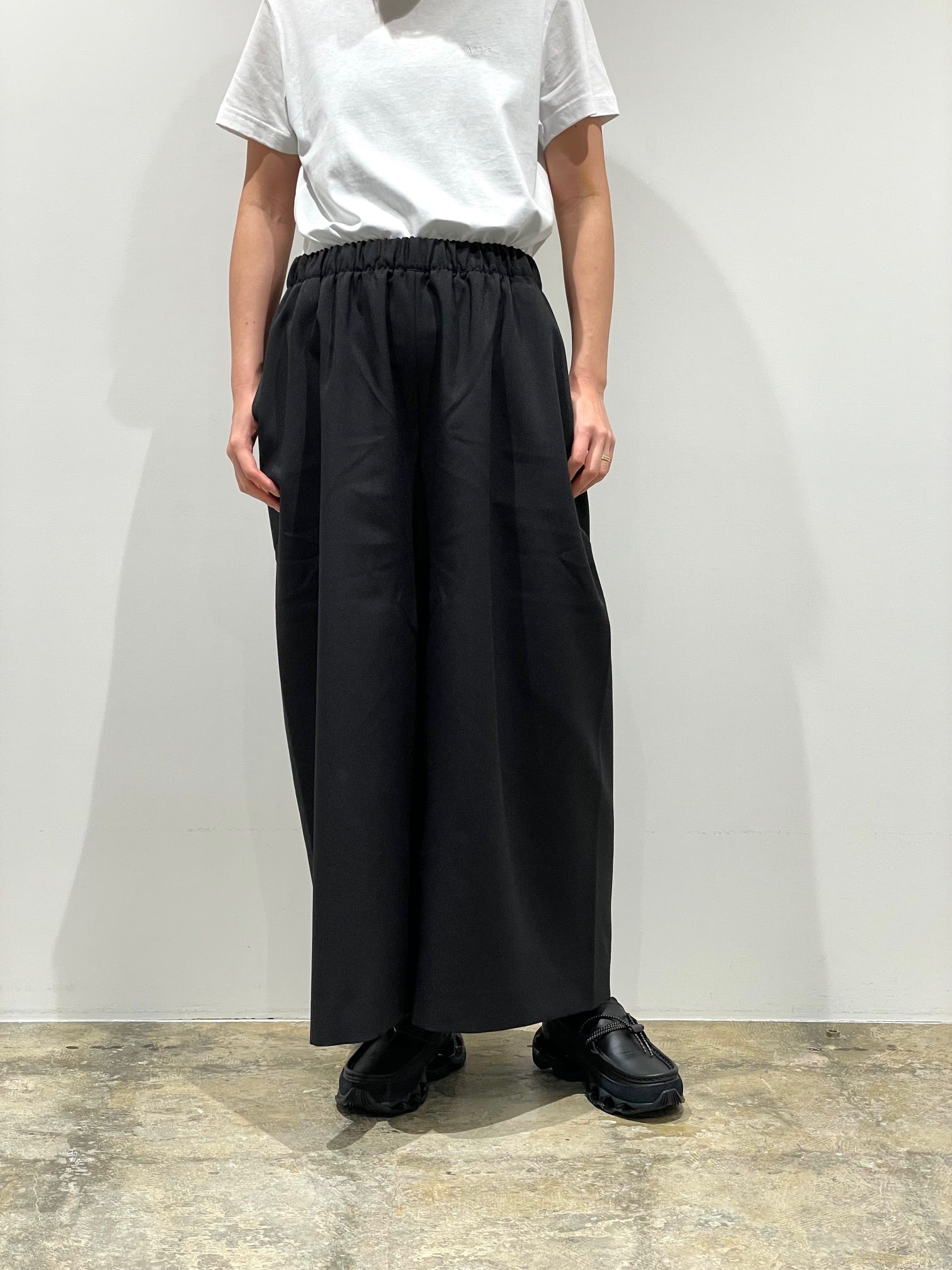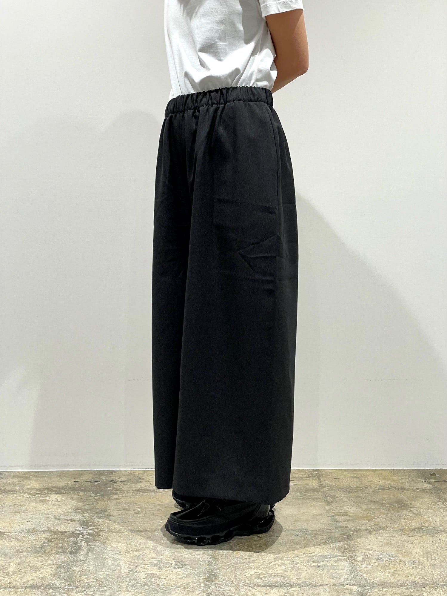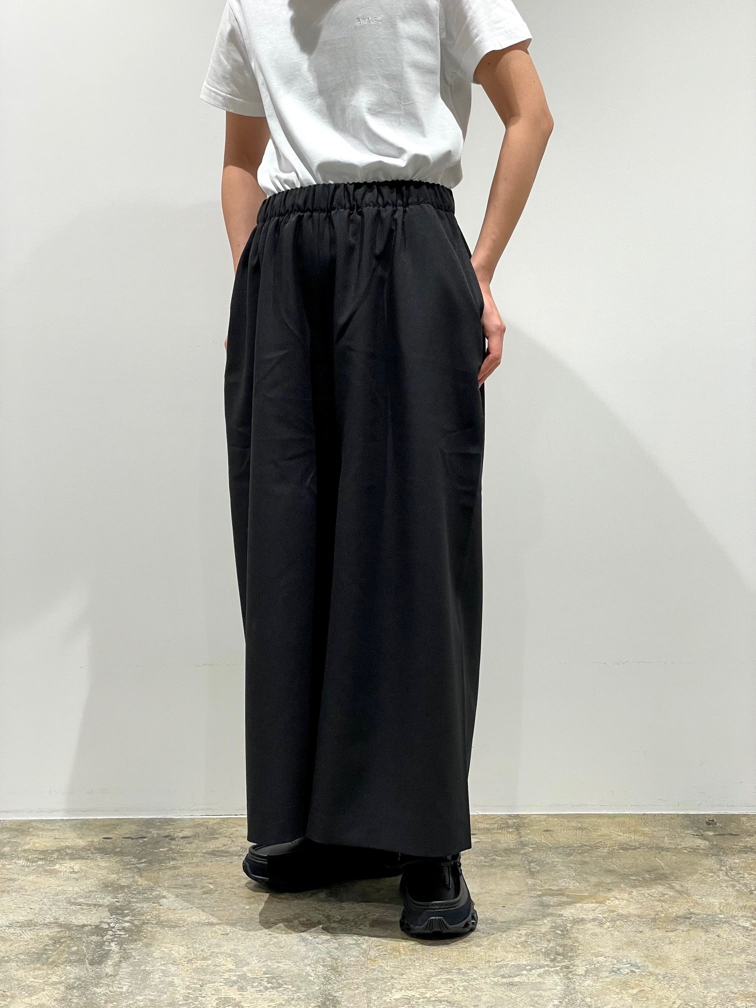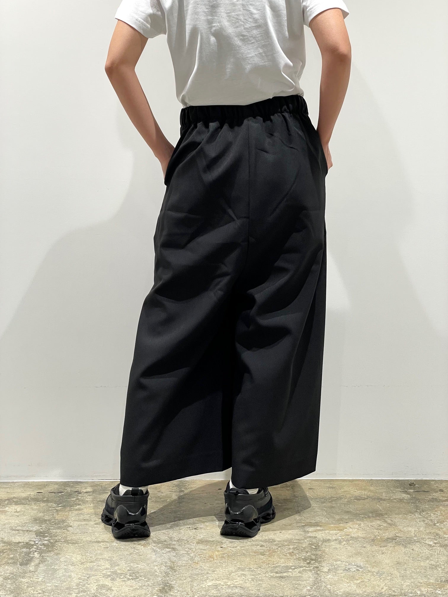 YAECA定番の2Way素材を使った太めのクロップドパンツ。股上が深くスカートのようなシルエットにも見える。ウエストゴムでリラックスした履き心地。動きによって見え方、シルエットが変わるのも特徴的なパンツ。