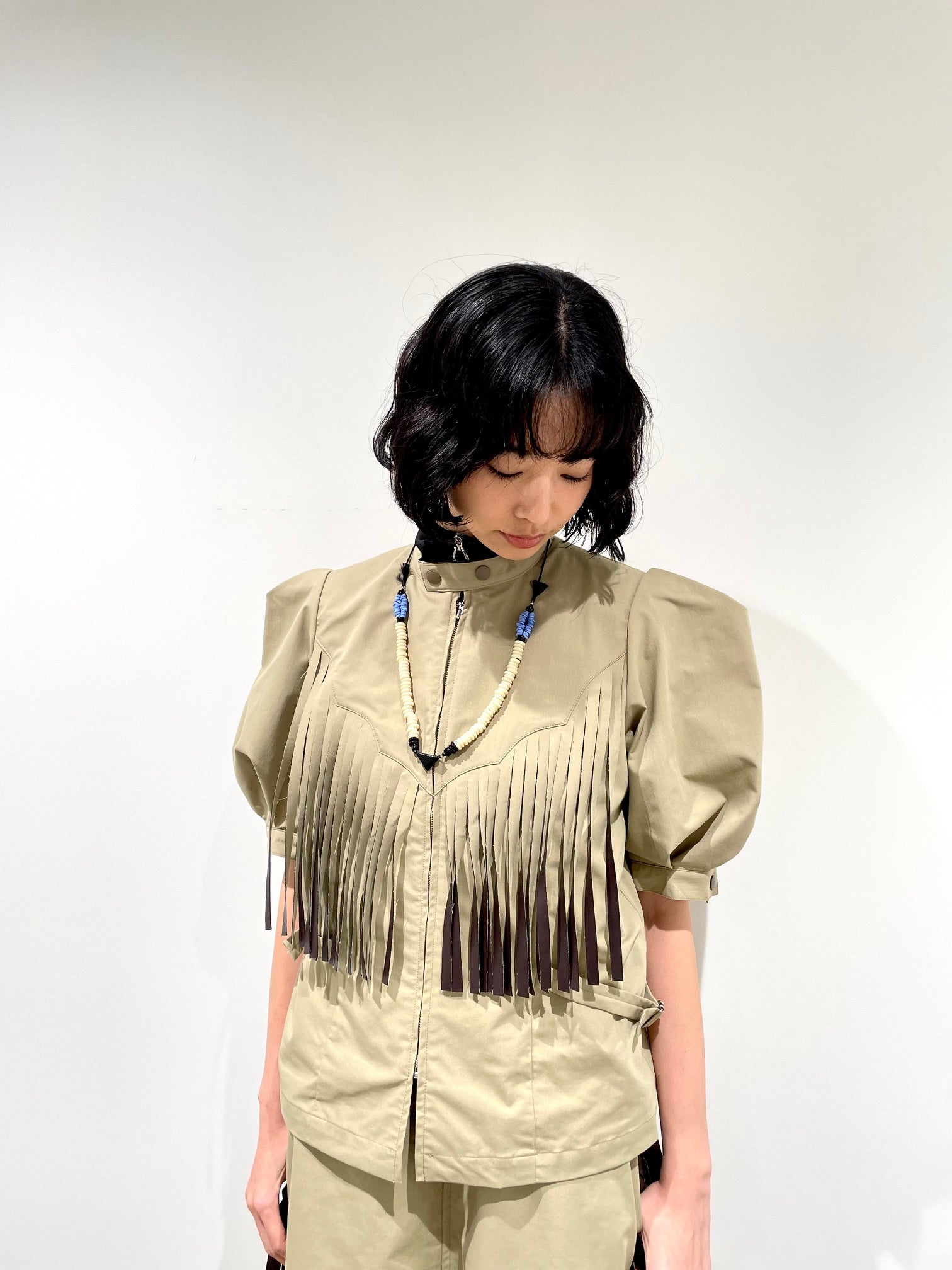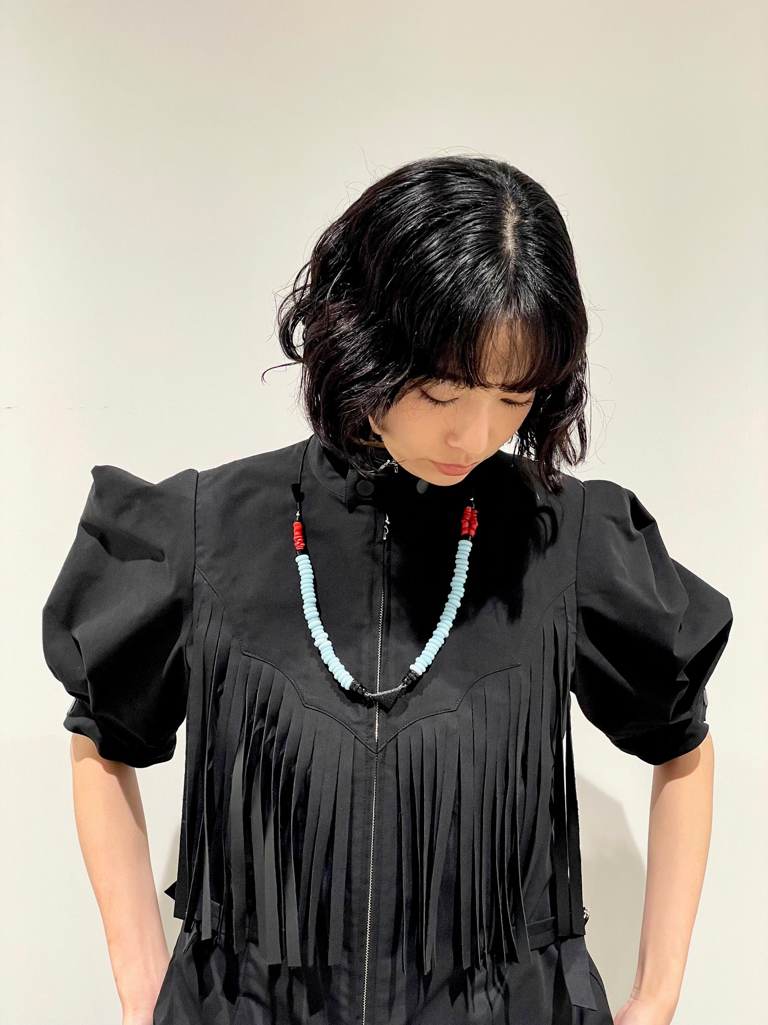 ガラスビーズが連なったモチーフネックレス。トーガアイコンのトライアングルモチーフ。後ろの金具で長さ調節。