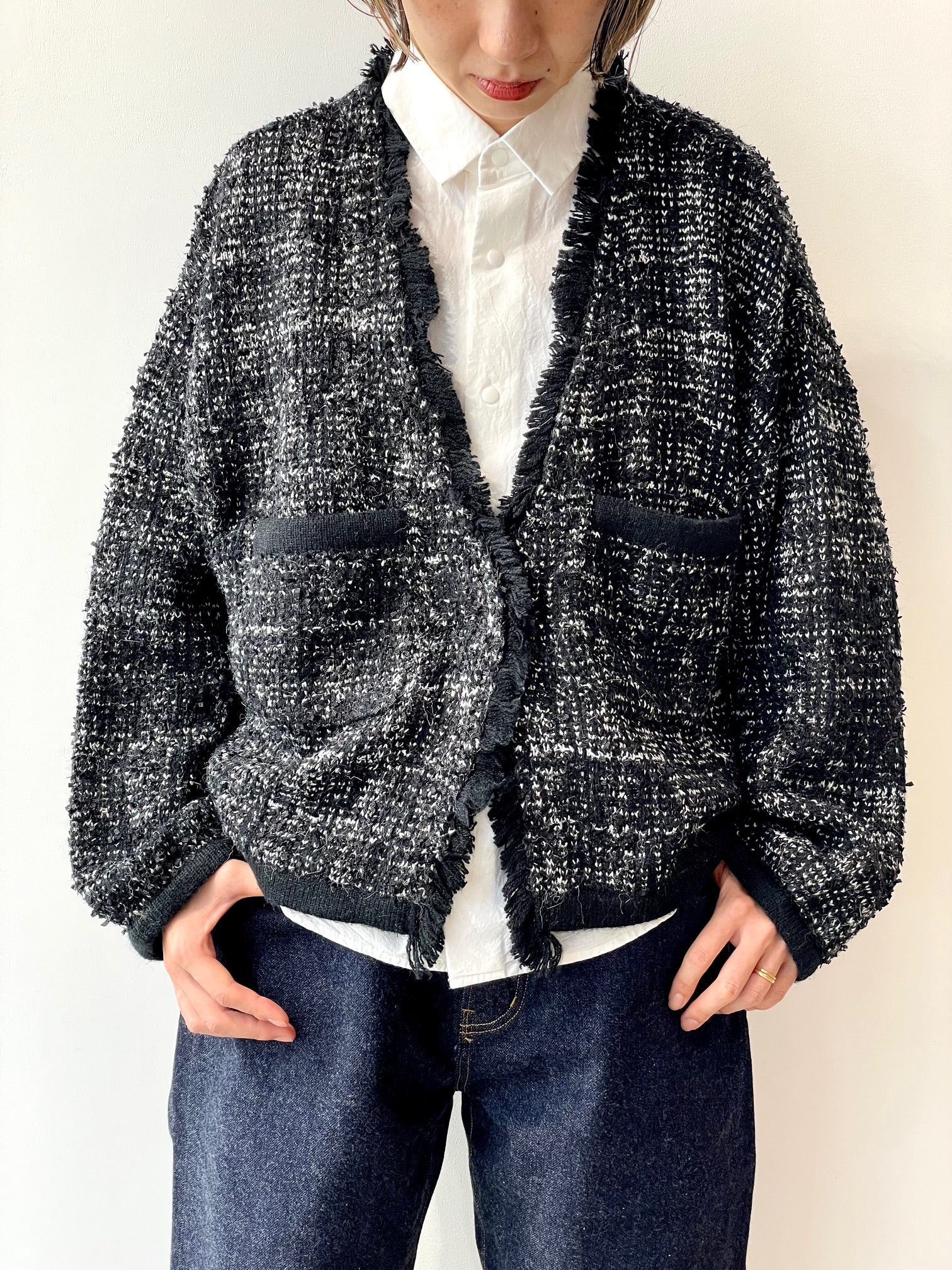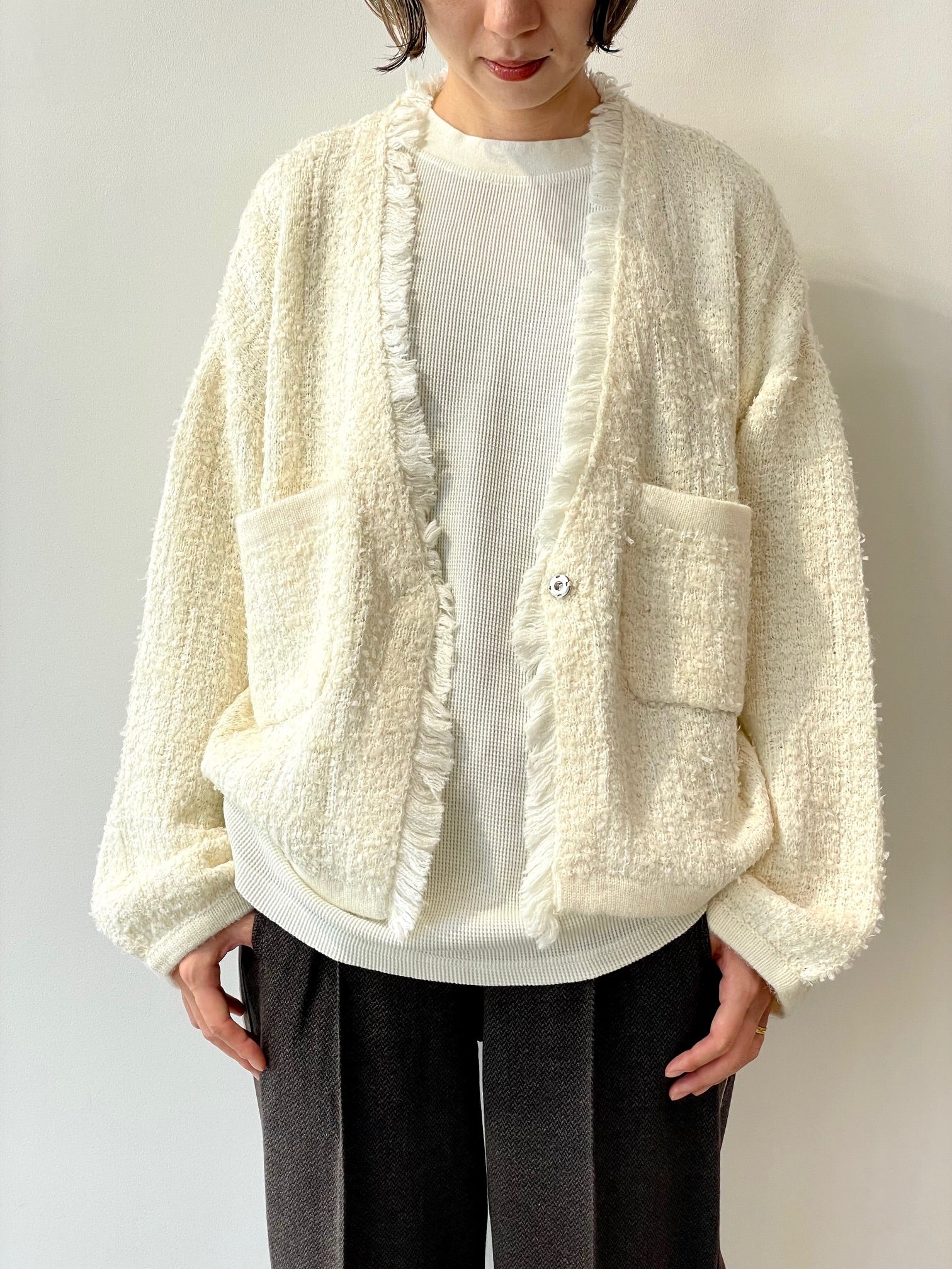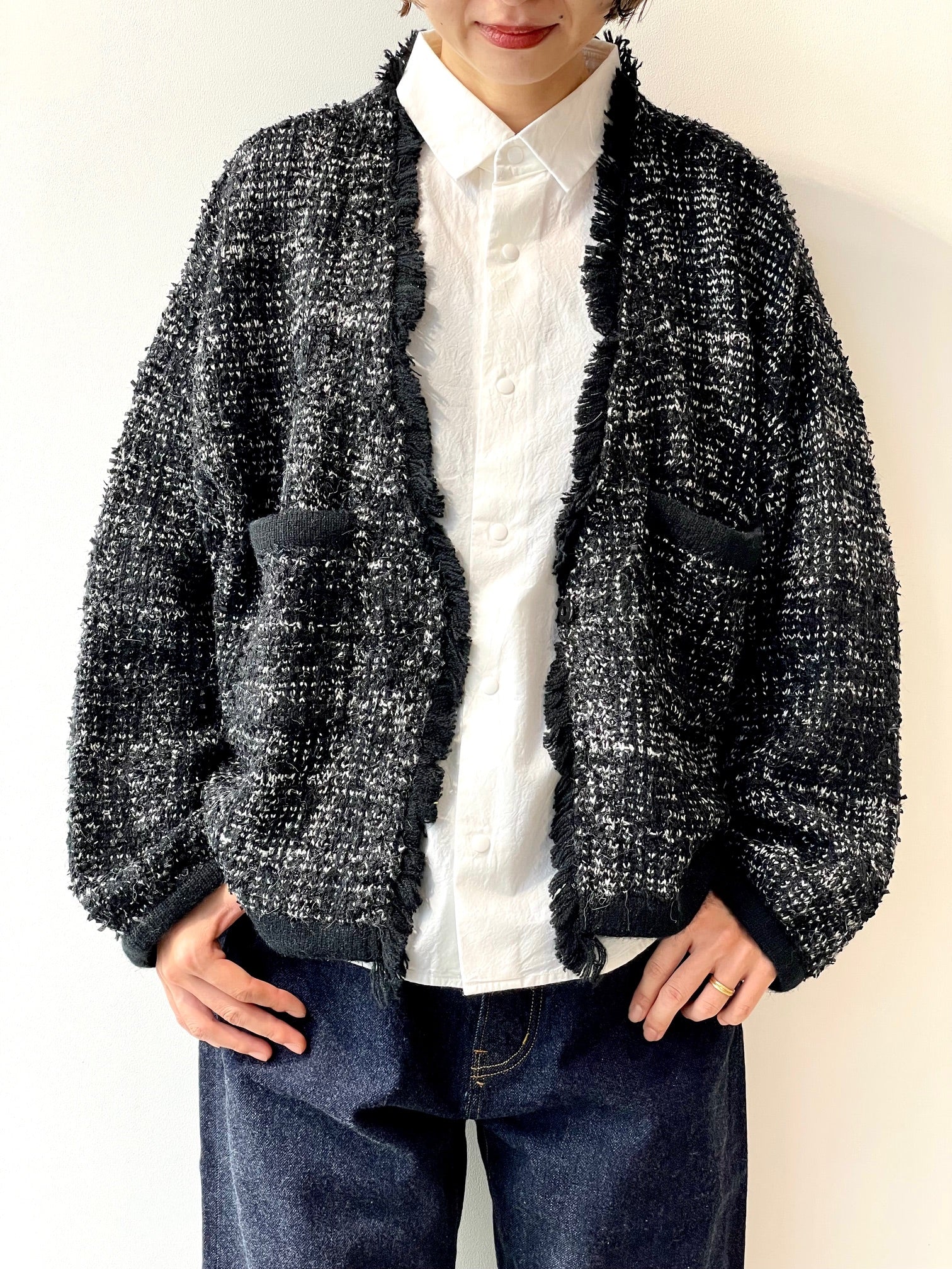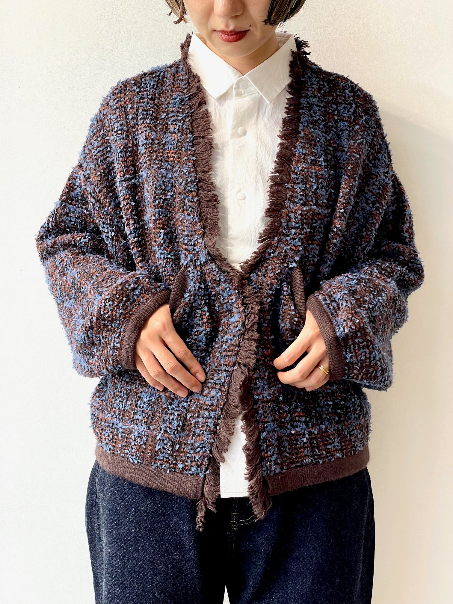 ツイード柄のノーカラージャケット。カーディガンの様にも着用できてこれから重宝するアイテム。襟元にフリンジ。それぞれに配色。一つボタン開閉。ワイドでリラックスなゆったりシルエット。太めの袖もかわいい。