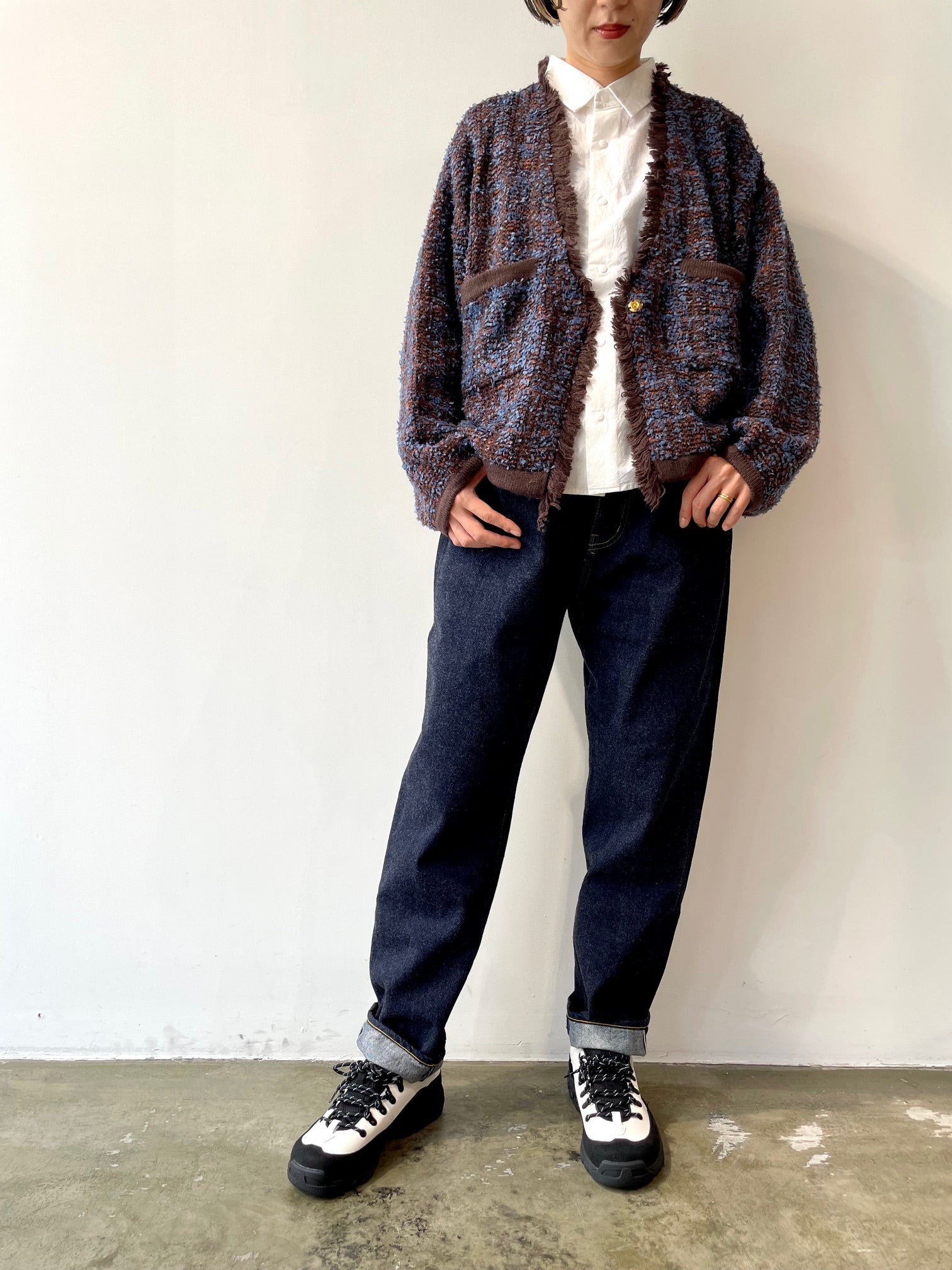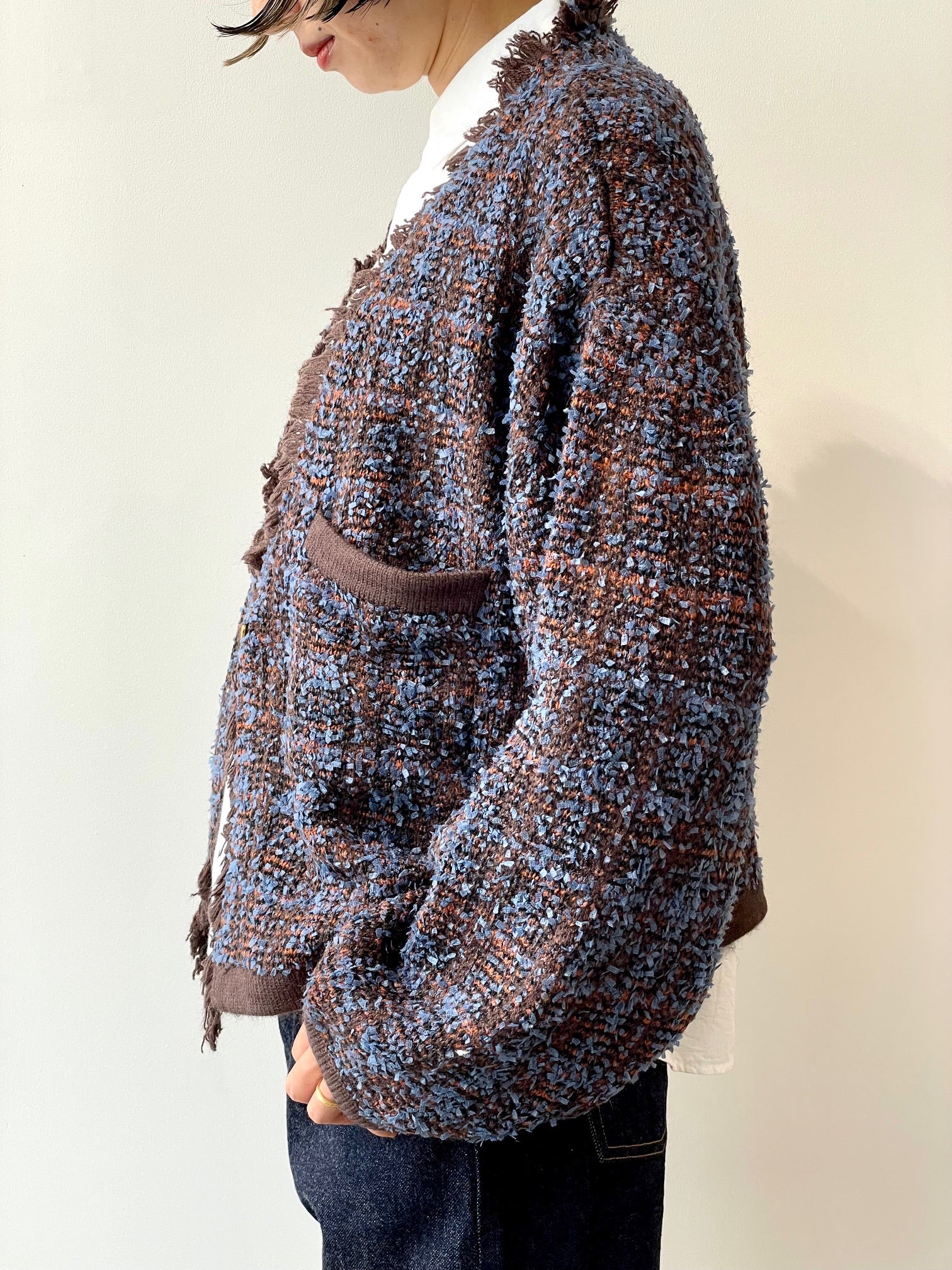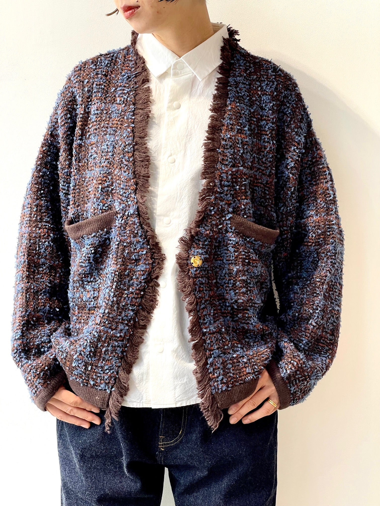 ツイード柄のノーカラージャケット。カーディガンの様にも着用できてこれから重宝するアイテム。襟元にフリンジ。それぞれに配色。一つボタン開閉。ワイドでリラックスなゆったりシルエット。太めの袖もかわいい。