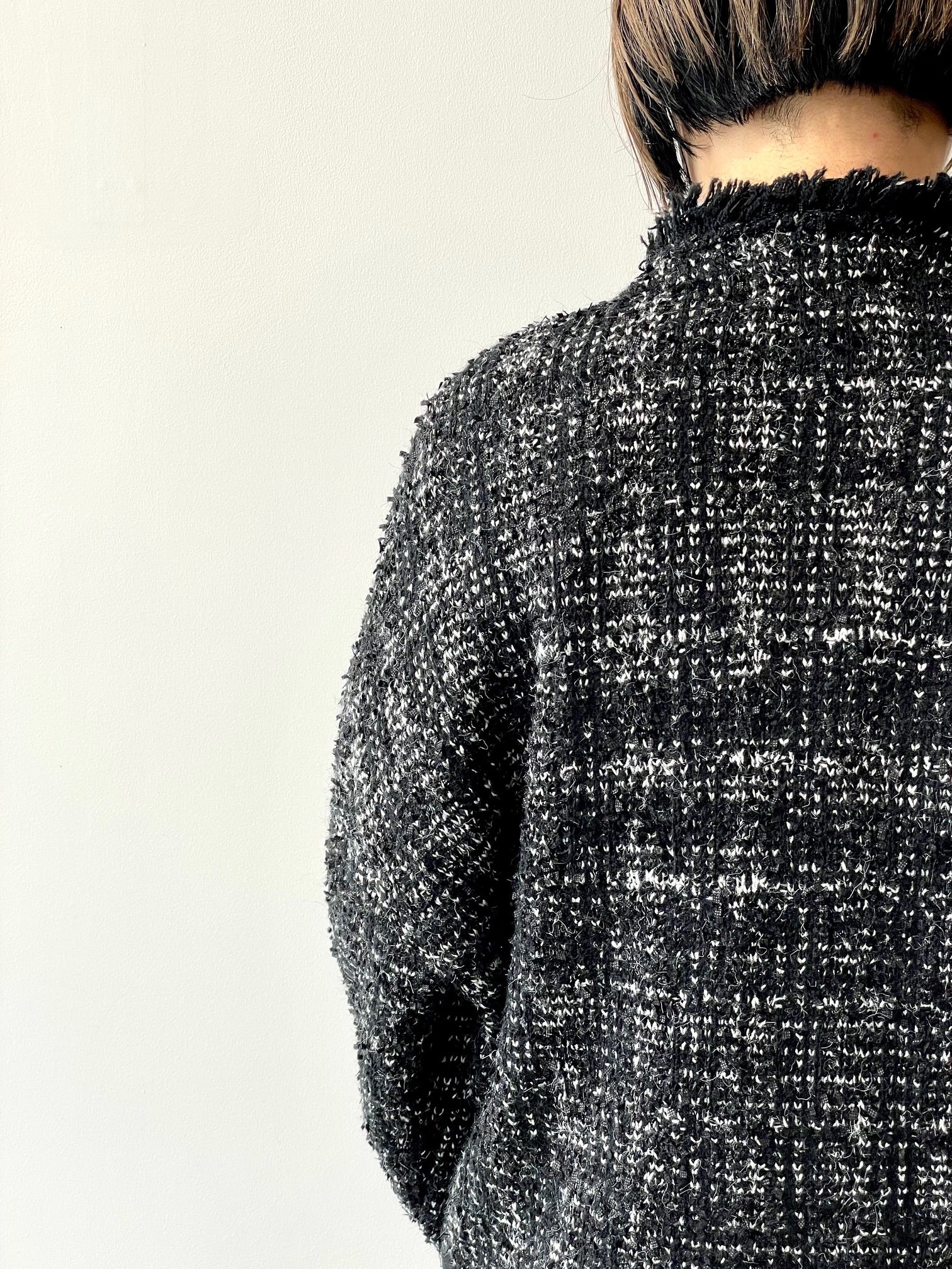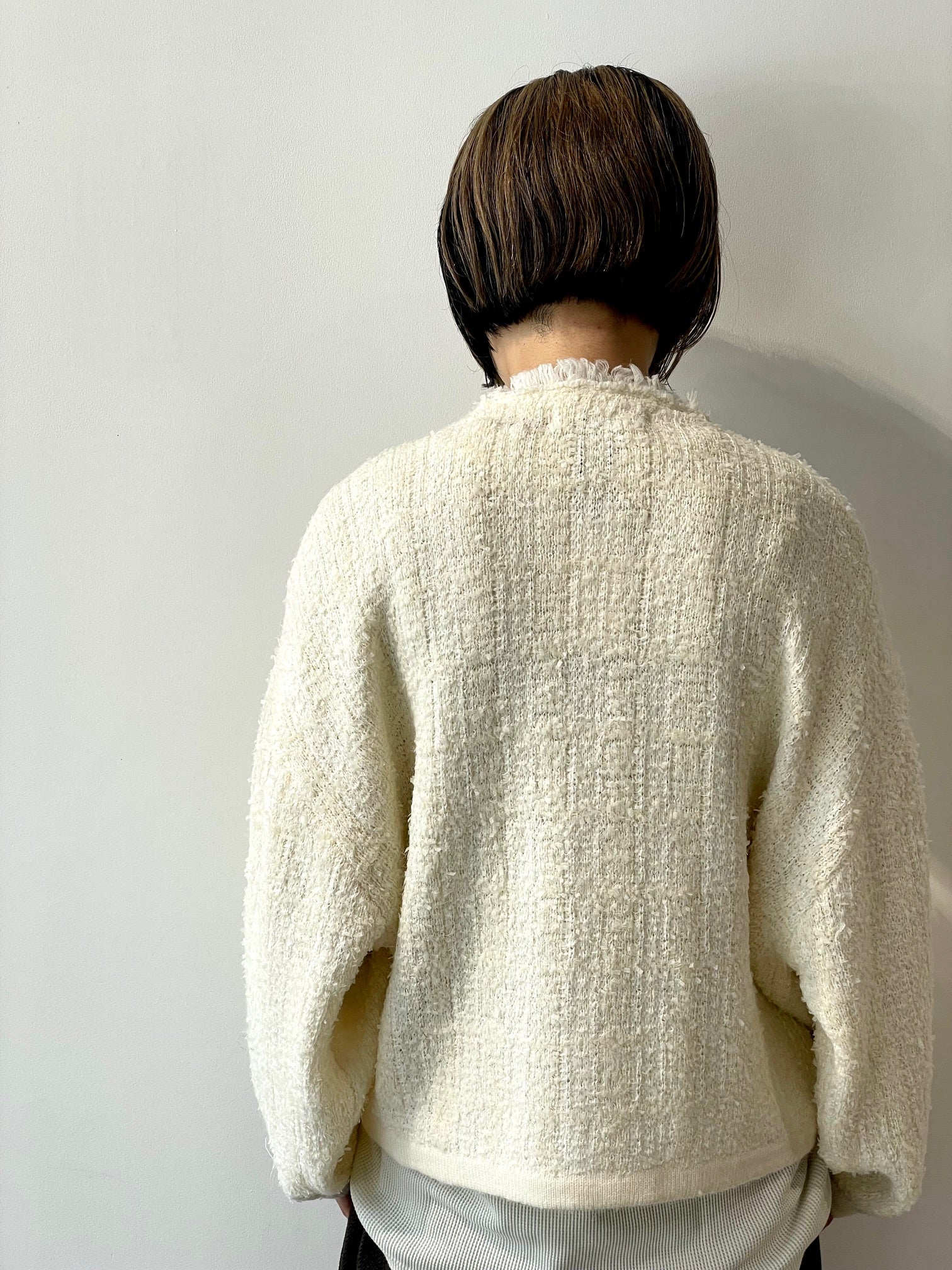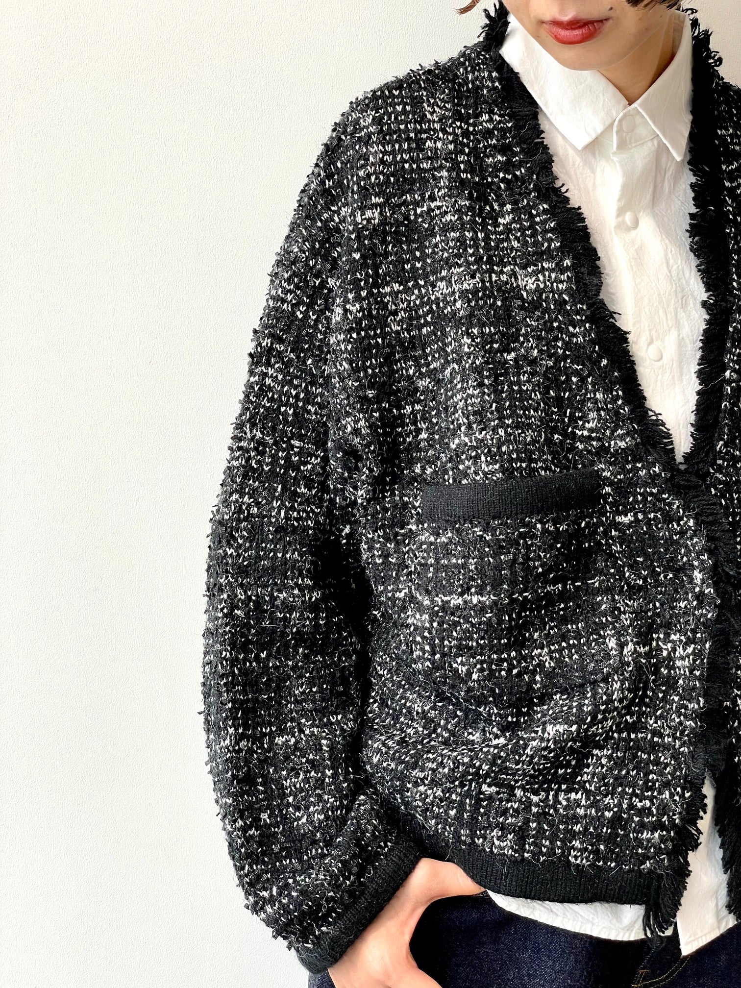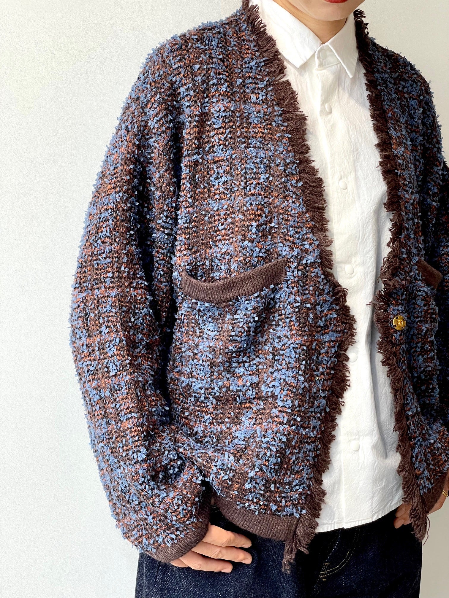 ツイード柄のノーカラージャケット。カーディガンの様にも着用できてこれから重宝するアイテム。襟元にフリンジ。それぞれに配色。一つボタン開閉。ワイドでリラックスなゆったりシルエット。太めの袖もかわいい。