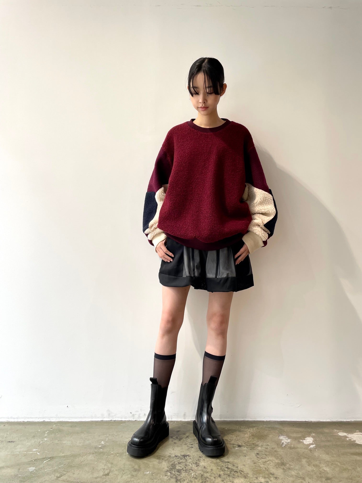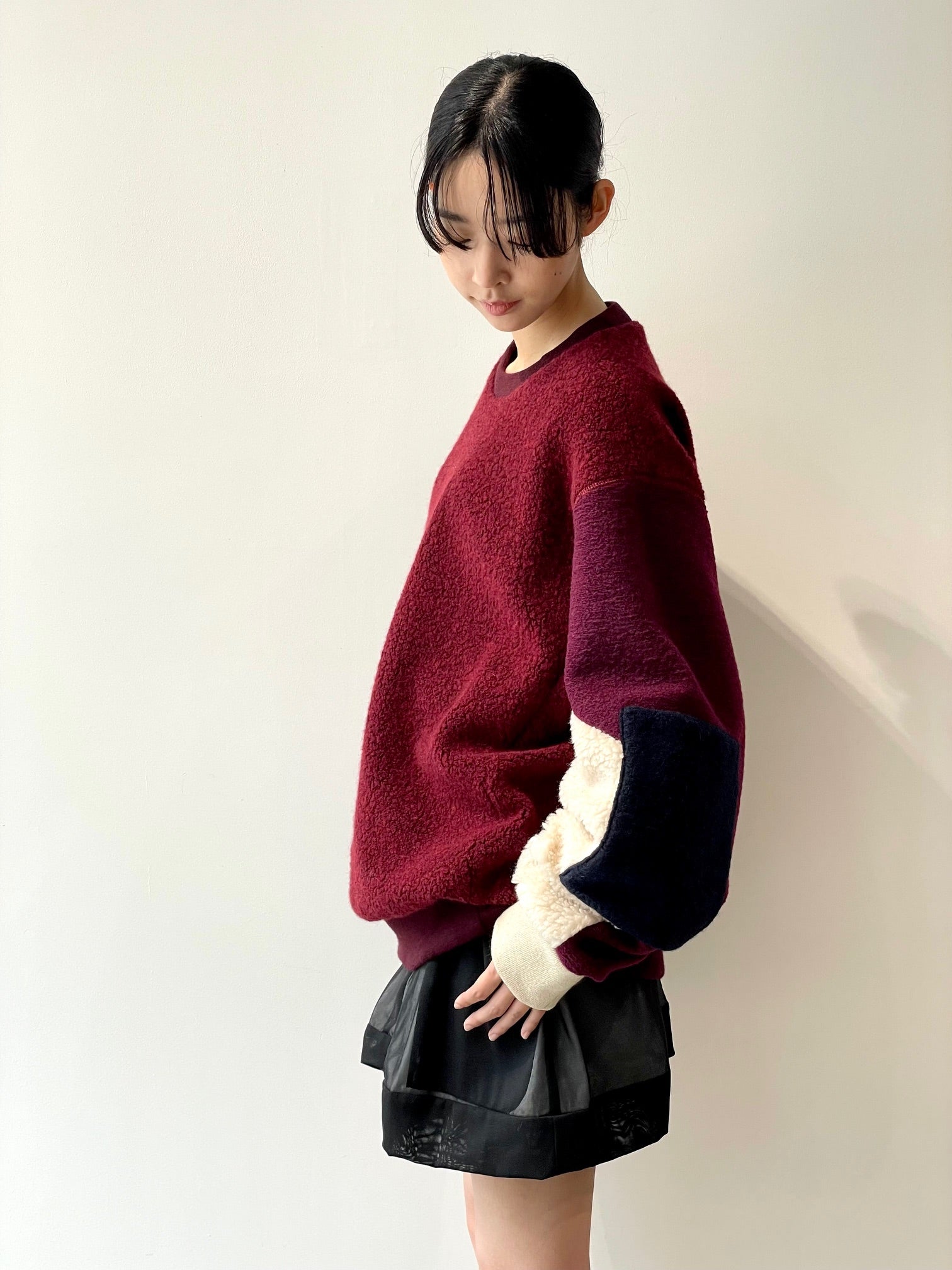 暖かみを感じるボリューミーなウールパイル生地をそれぞれの部位に配色したプルオーバー。ゆったりとしたシルエット。裏地付き。