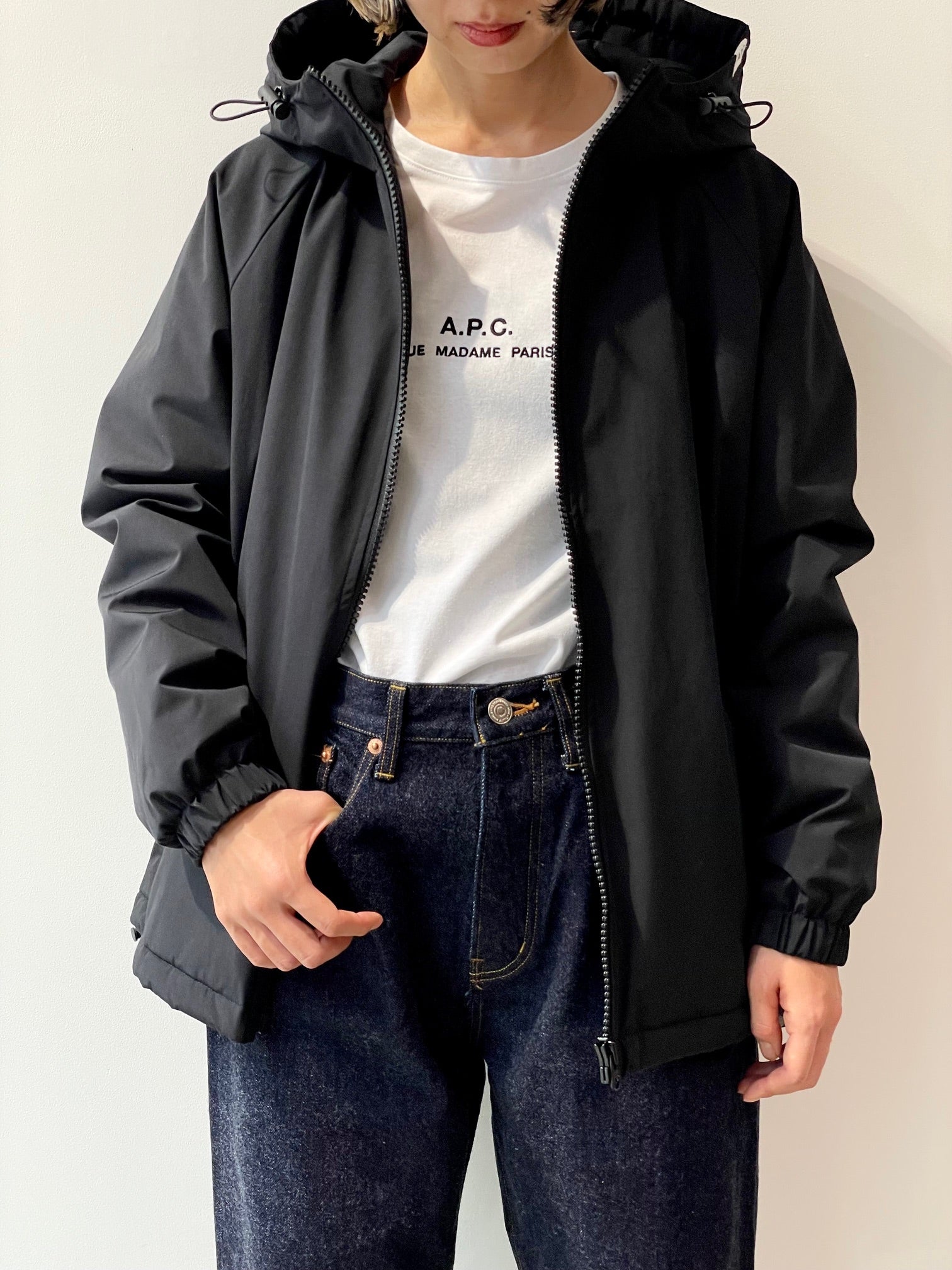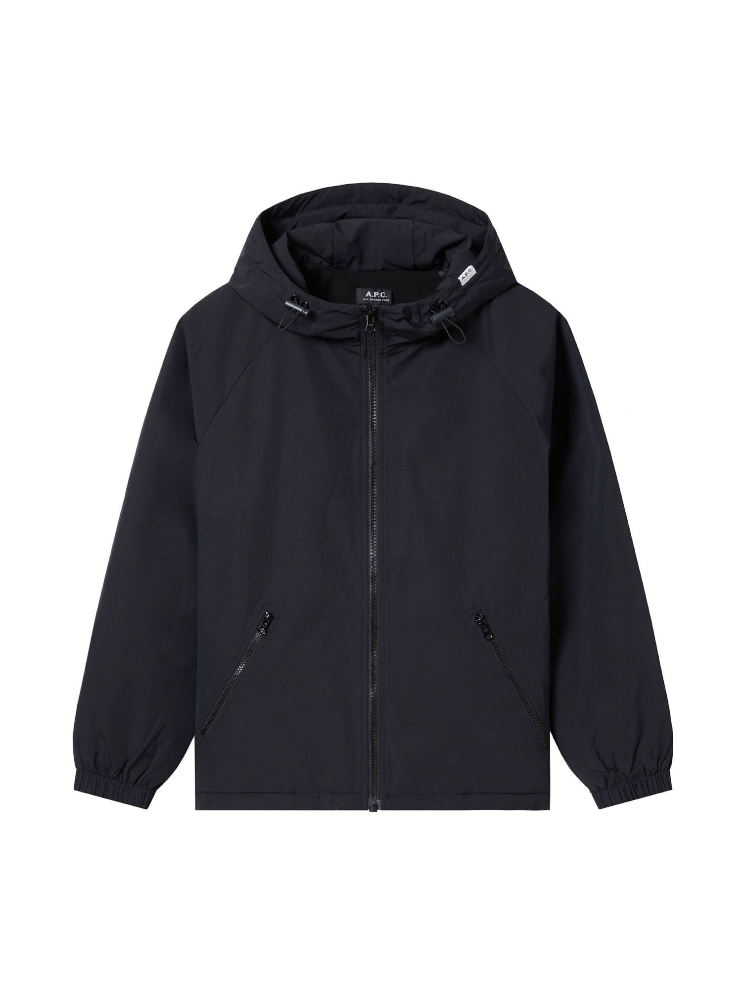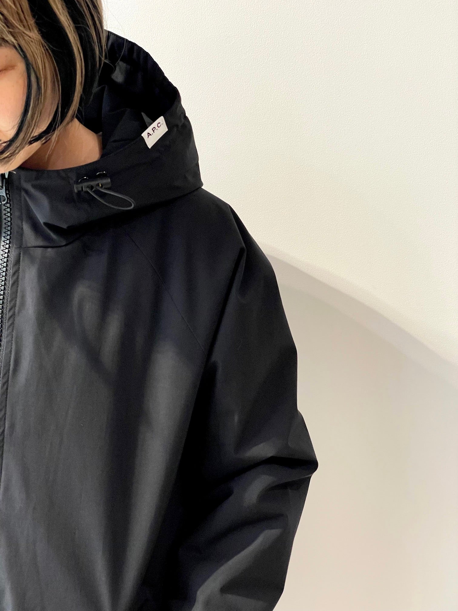 テクニックギャバジンのフード付きブルゾン。フードは調節可能なドローコード付き。フードにA.P.C.のラベル。ラグランスリーブで体を包み込むシルエット。身頃にフリースの裏地で保温性も特徴のアウター。裾にも調節可能なドローコード。ユニセックスサイズ。