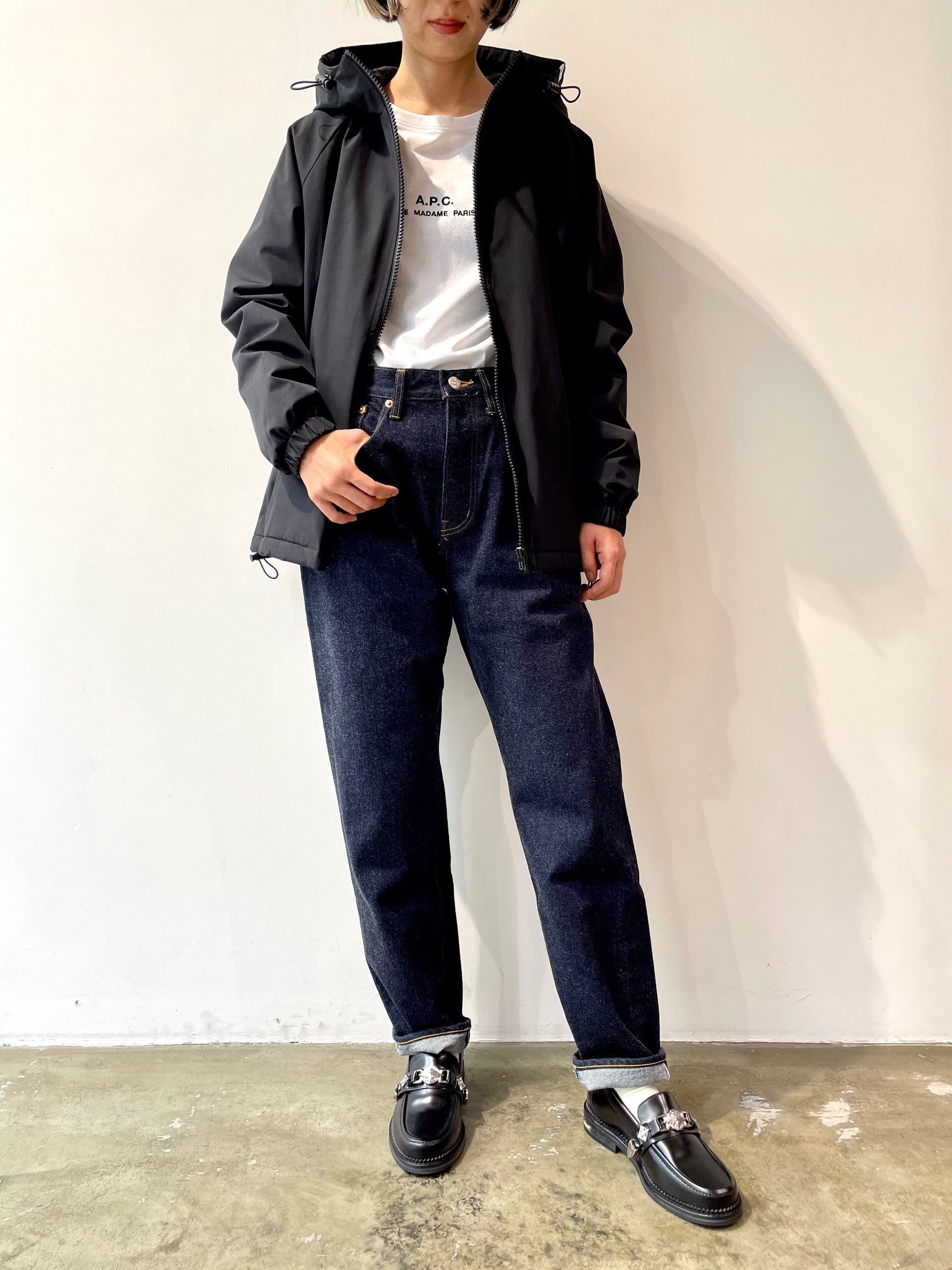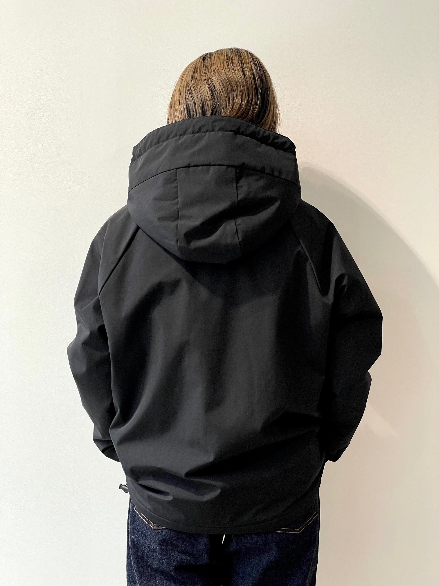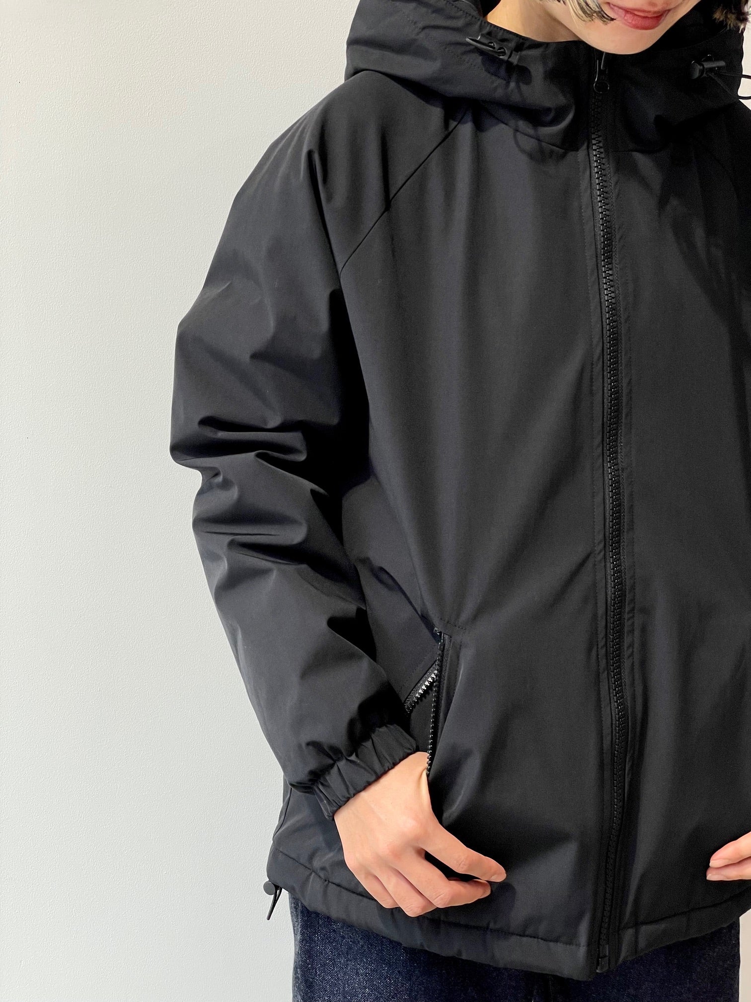 テクニックギャバジンのフード付きブルゾン。フードは調節可能なドローコード付き。フードにA.P.C.のラベル。ラグランスリーブで体を包み込むシルエット。身頃にフリースの裏地で保温性も特徴のアウター。裾にも調節可能なドローコード。ユニセックスサイズ。